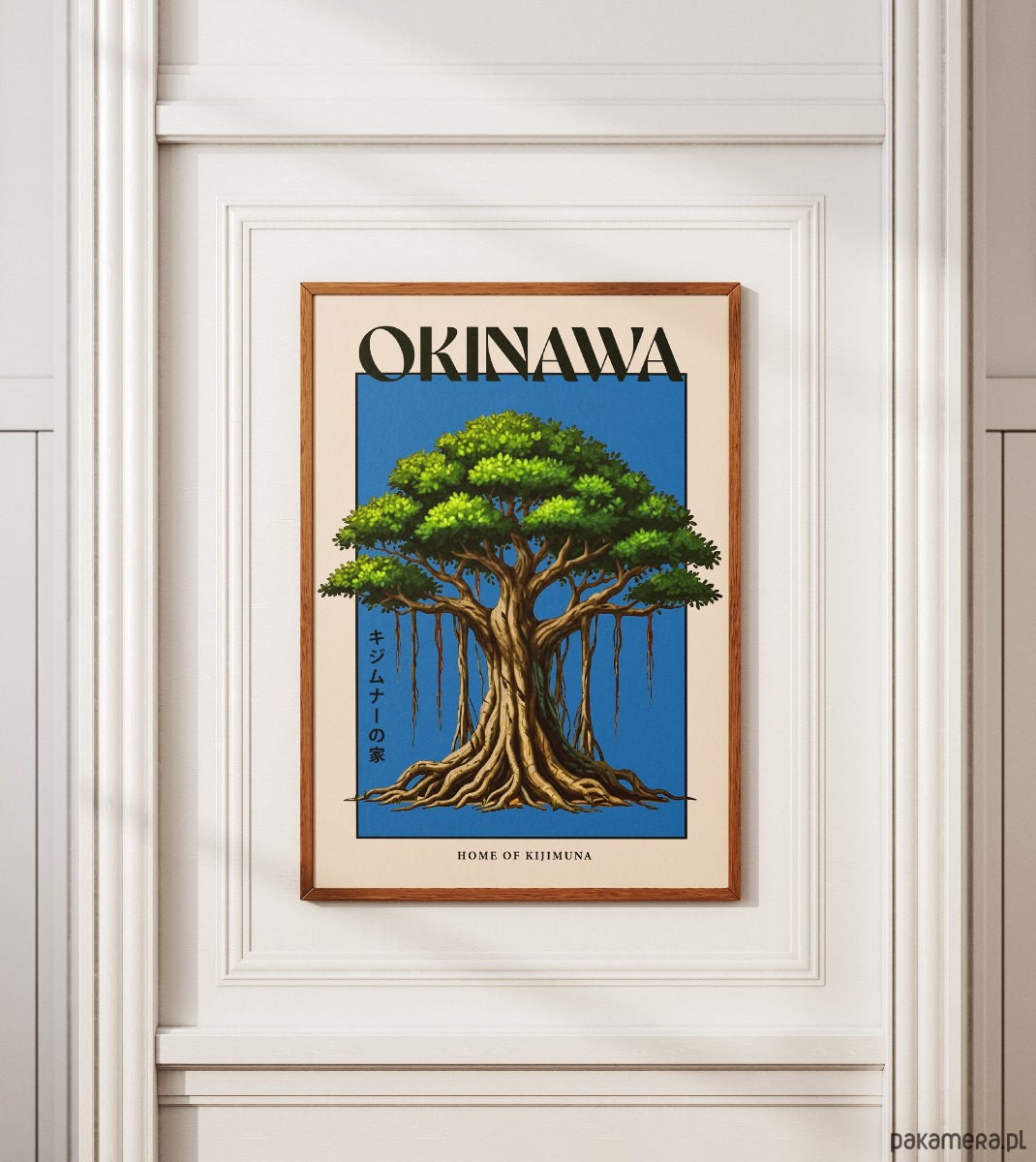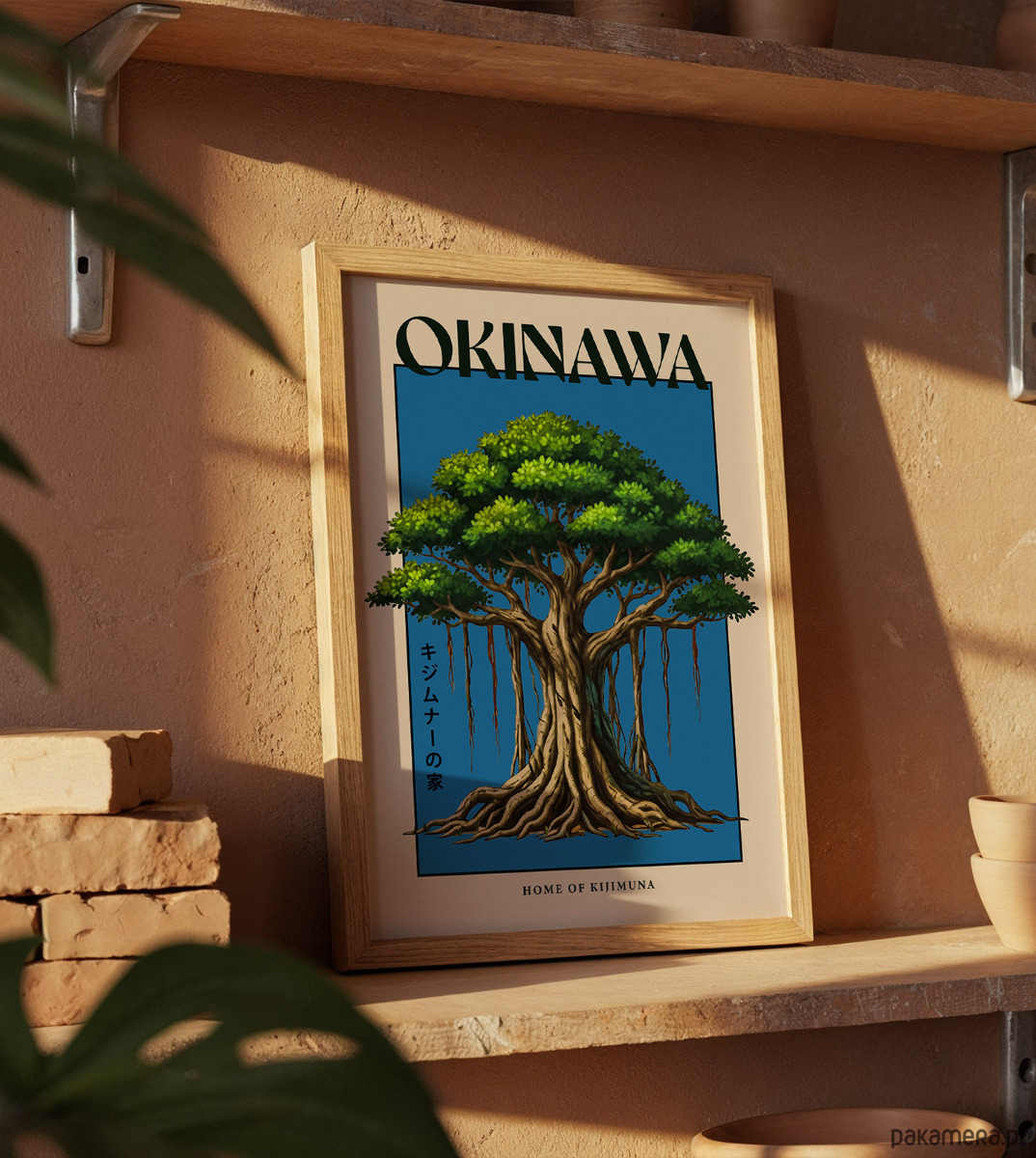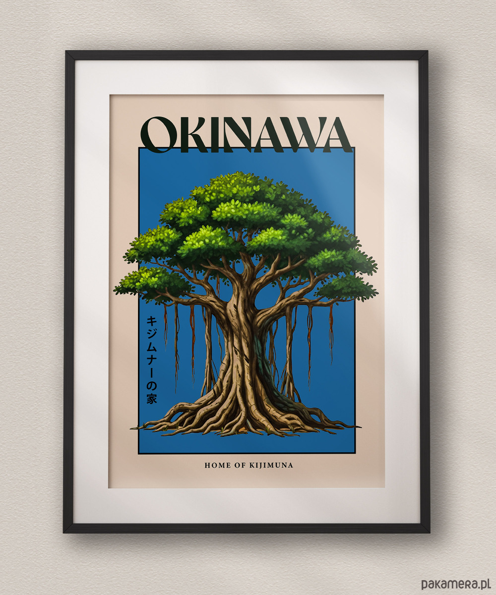 Przenieś się do serca japońskiego archipelagu dzięki plakatowi Okinawa. Głównym bohaterem tej minimalistycznej grafiki jest majestatyczne drzewo Gajumaru (Święty Banian), które w lokalnej kulturze uchodzi za łącznik między światem ludzi a światem duchów.