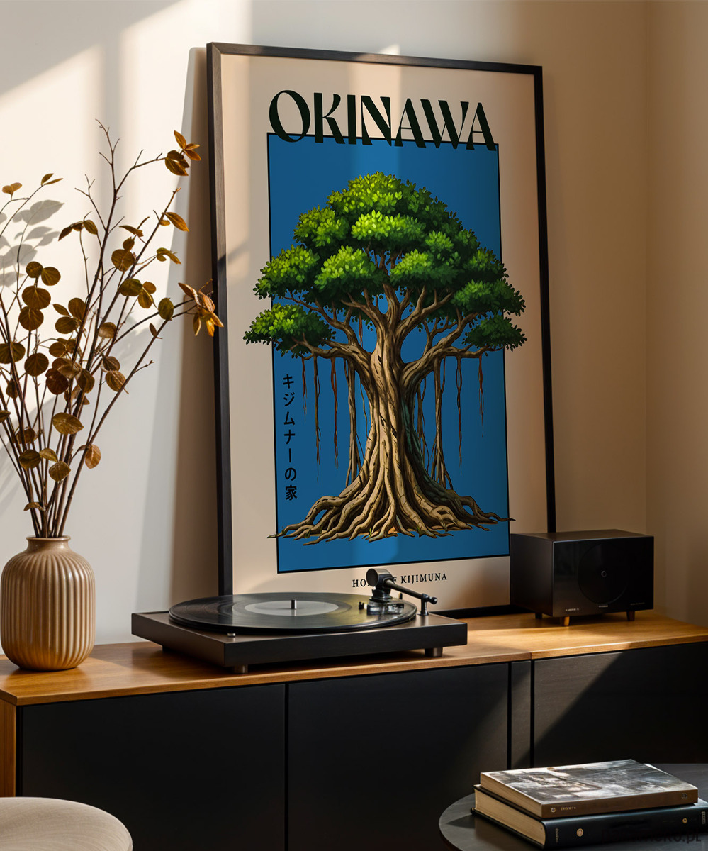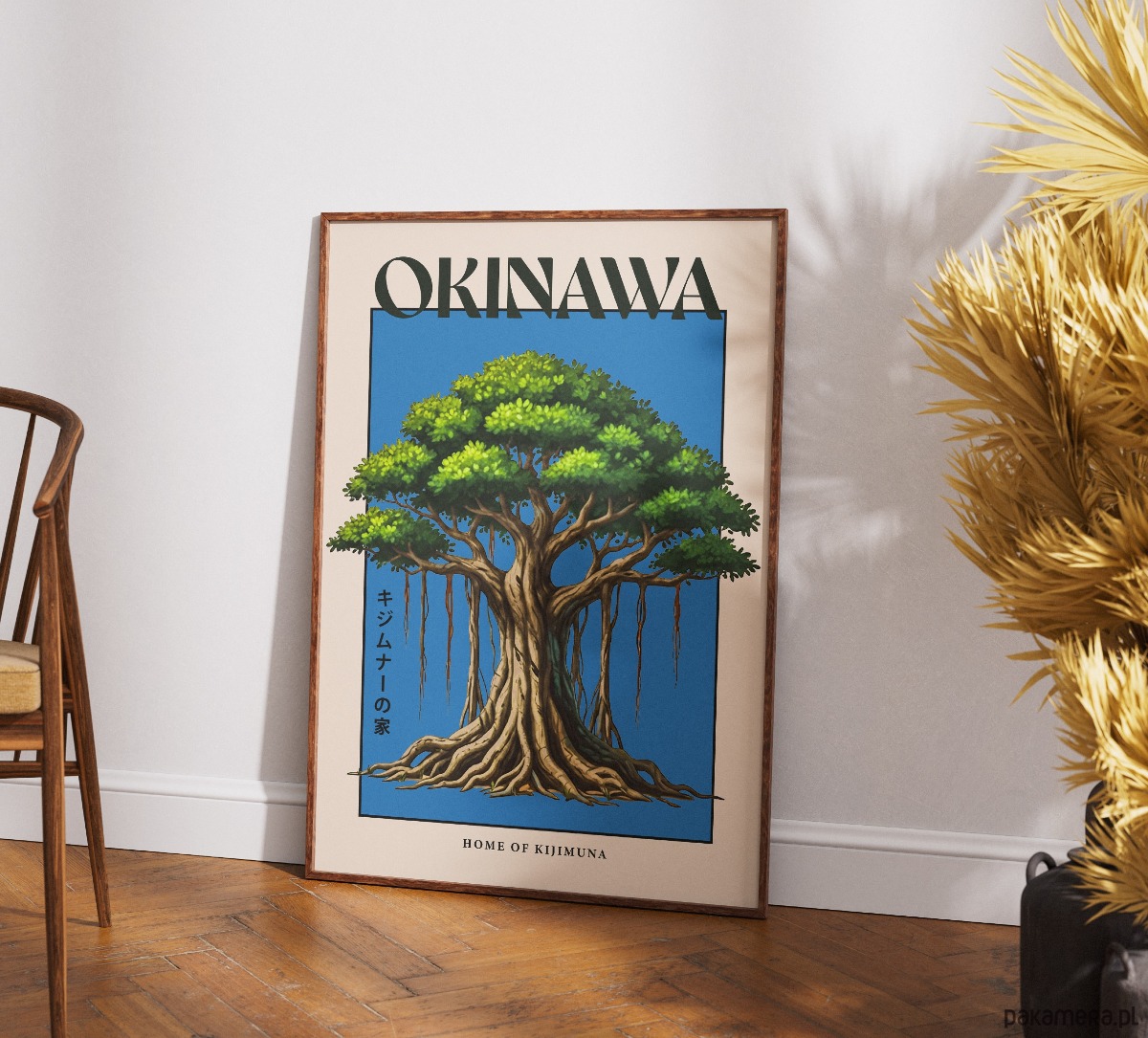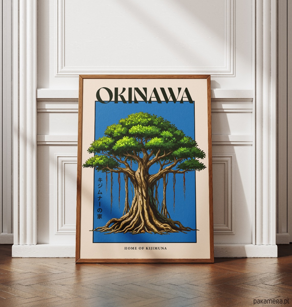 Przenieś się do serca japońskiego archipelagu dzięki plakatowi Okinawa. Głównym bohaterem tej minimalistycznej grafiki jest majestatyczne drzewo Gajumaru (Święty Banian), które w lokalnej kulturze uchodzi za łącznik między światem ludzi a światem duchów.
