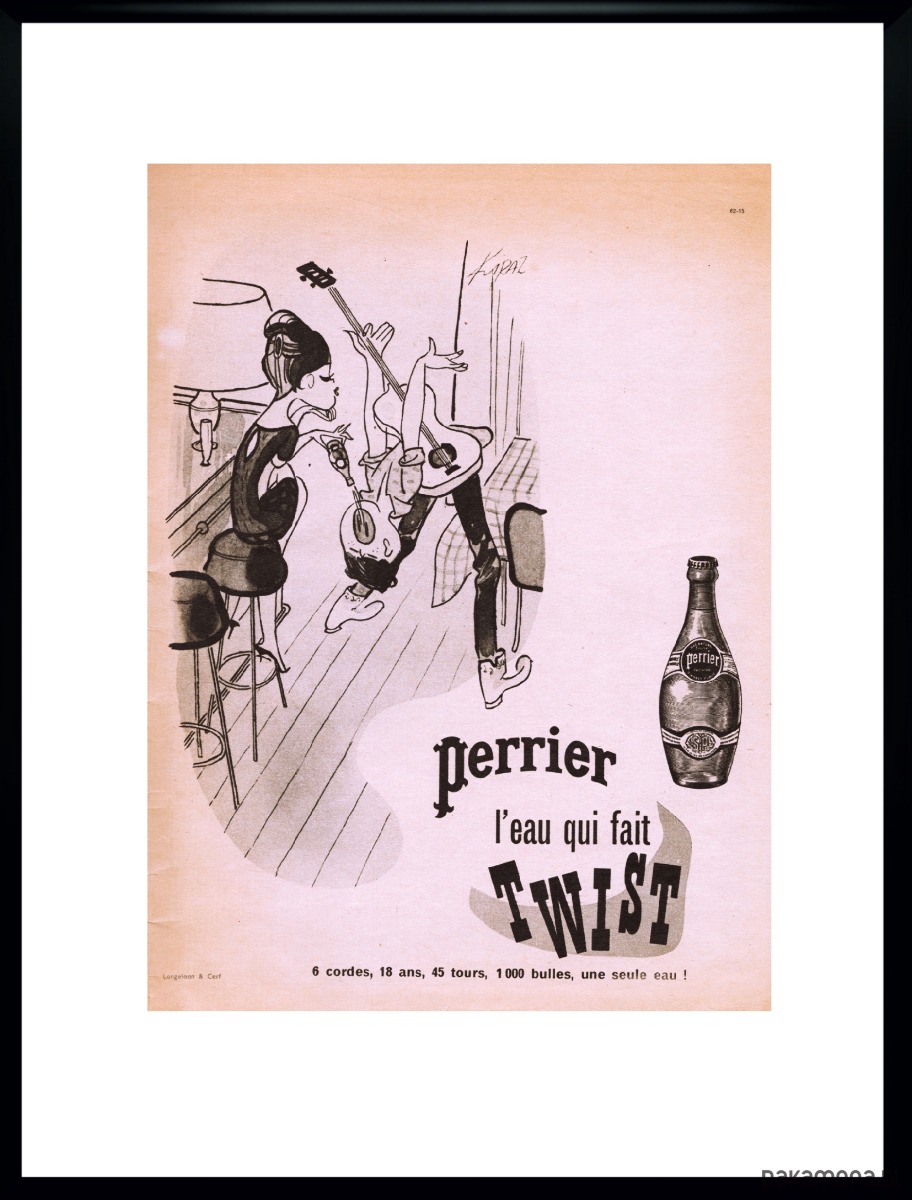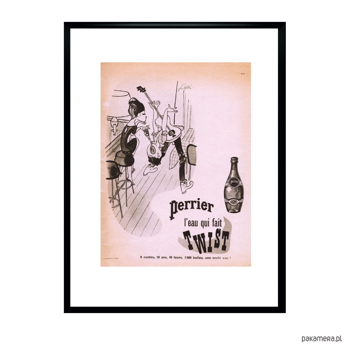 Oprawiona francuska reklama wody PERRIER l'eau qui fait twist z 1963 r, aut. Edmond Kiraz, w czarnych ramkach o wymiarach 30 x 40 cm