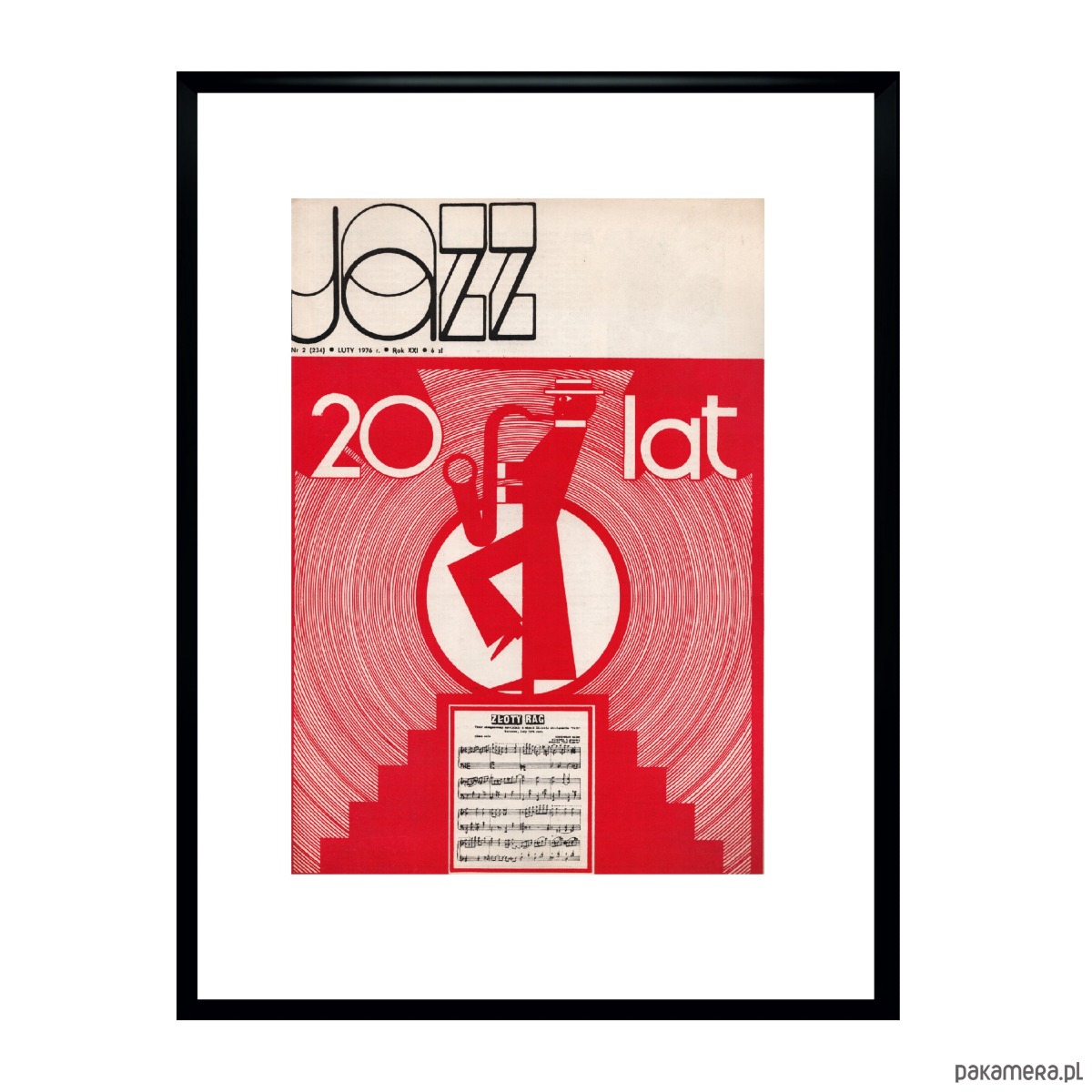 Oprawiona okładka czasopisma JAZZ, luty 1976, aut. Andrzej Krajewski, w czarnych ramkach o wymiarach 30 x 40 cm
