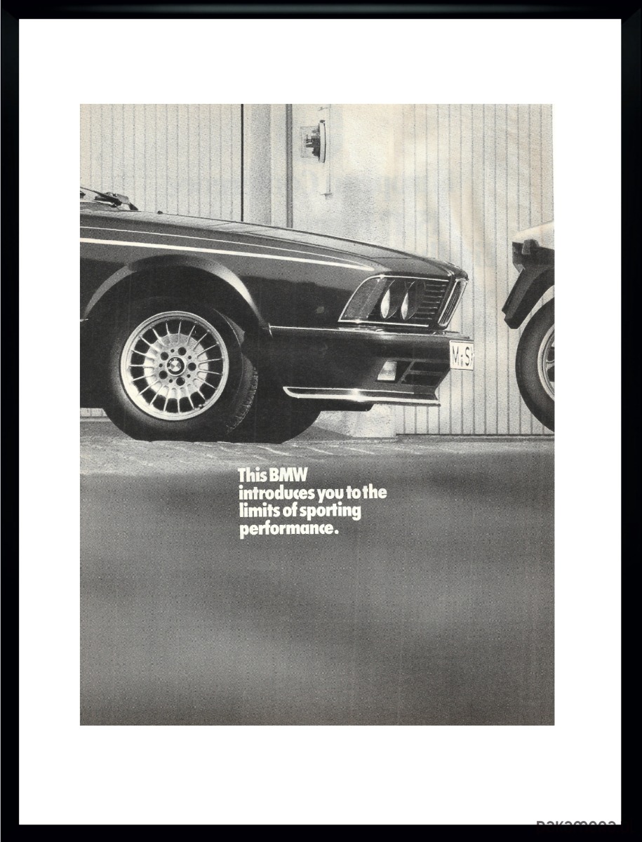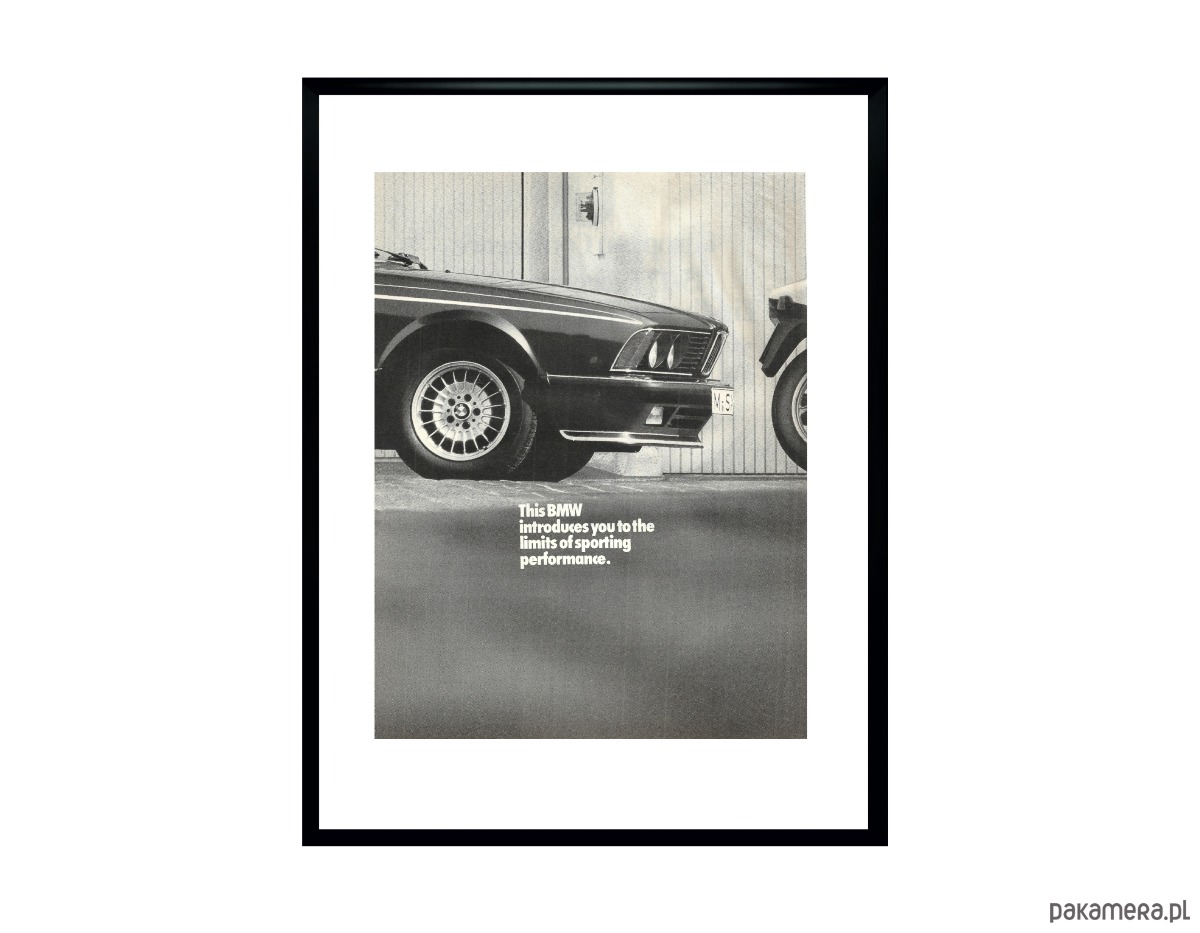 Oprawiona reklama BMW, lata 80te, w czarnych ramkach o wymiarach 30 x 40 cm