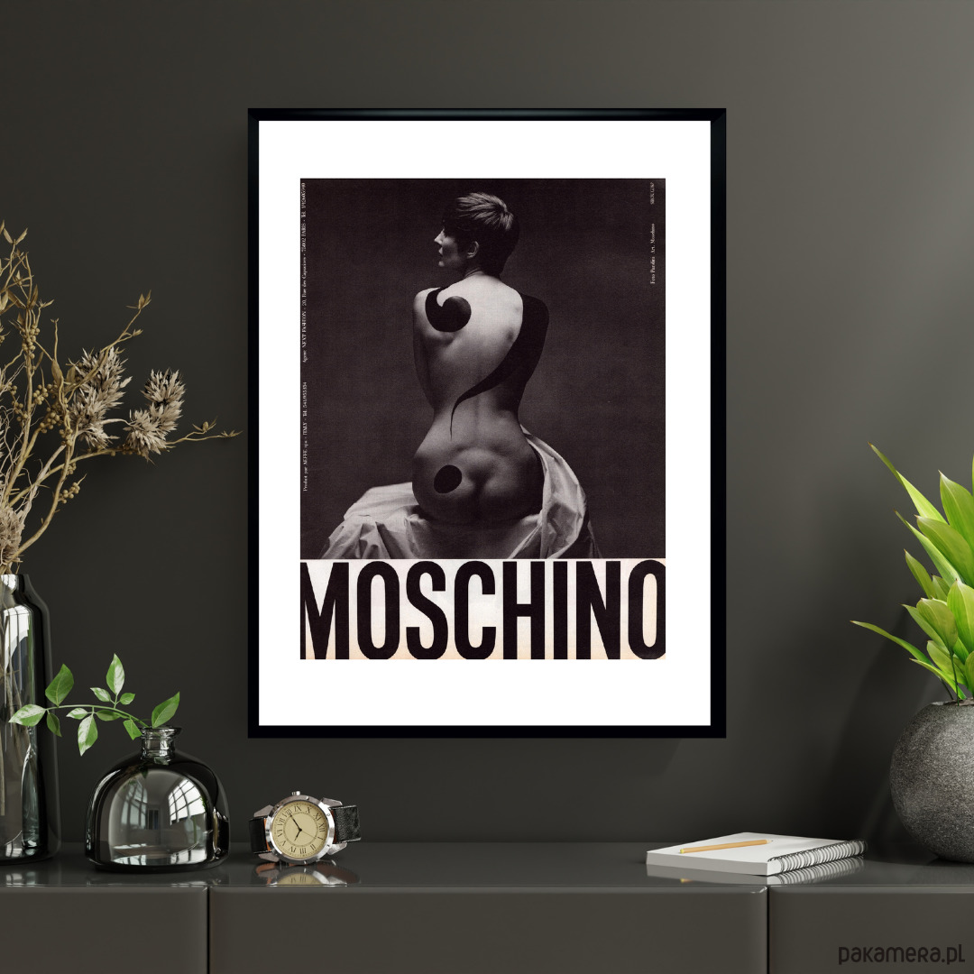 Oprawiona reklama domu mody MOSCHINO, 1990 r, w czarnych ramkach o wymiarach 30 x 40 cm