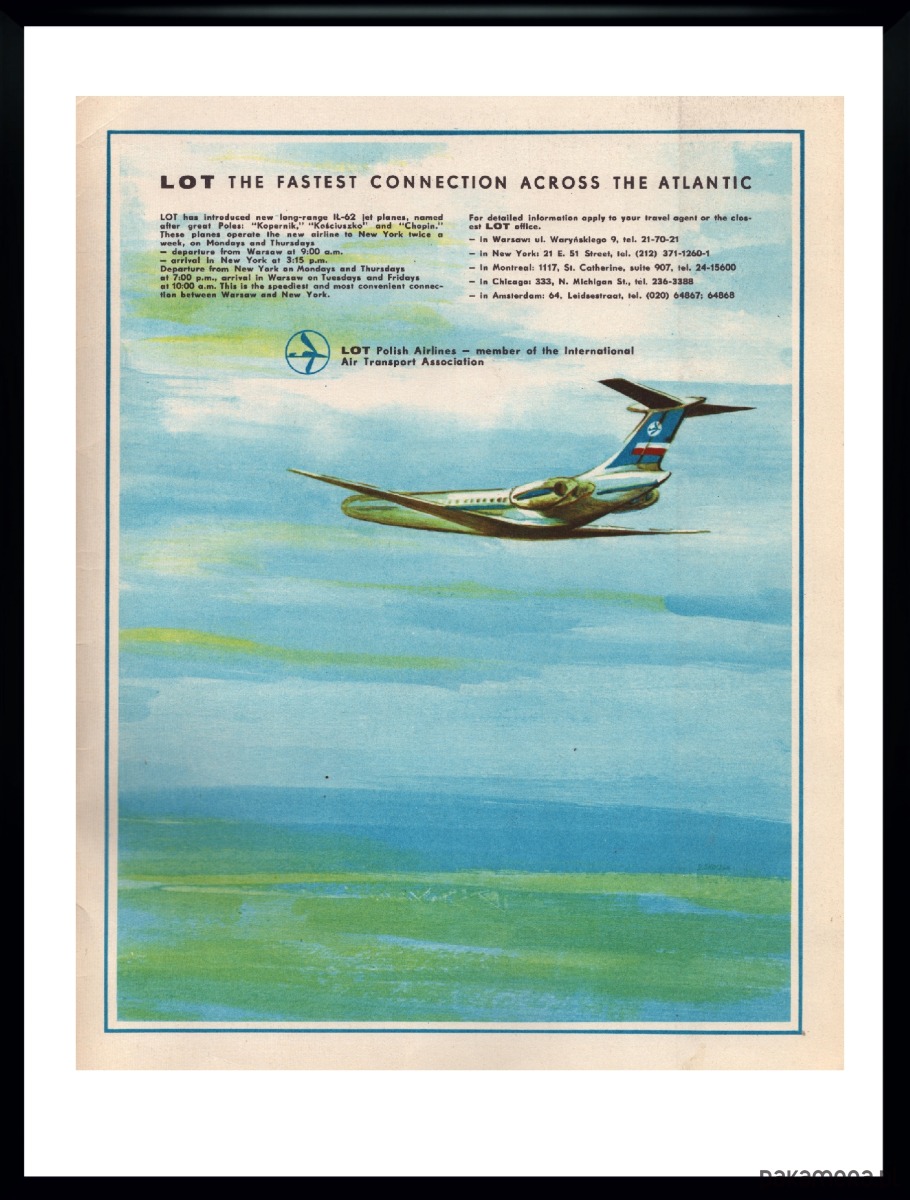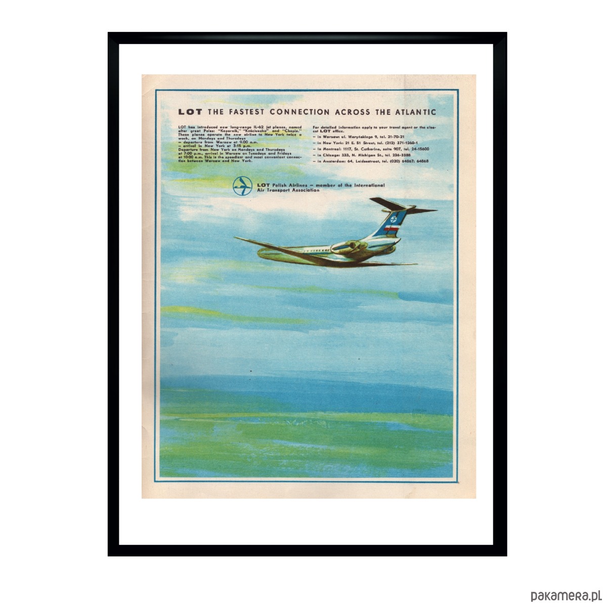 Oprawiona reklama LOT z Tupolew-134, w czarnych ramkach o wymiarach 30 x 40 cm