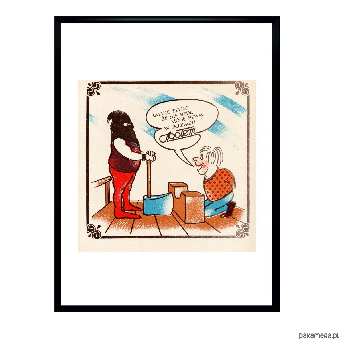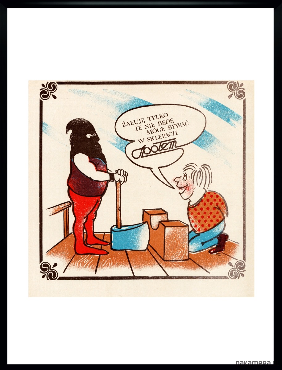 Na reklamie hasło reklamowe w komiksowej chmurce: "Żałuję tylko, że nie będę mógł bywać w sklepach SPOŁEM". Charakterystyczny dla tamtej epoki humorystyczny rysunek kata z siekierą i wystraszonej ofiary, która za chwilę straci swoje życia.