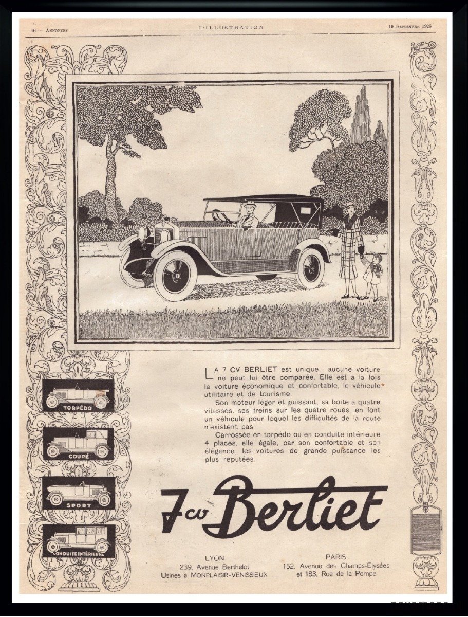 Oprawiona stara francuska reklama samochodu BERLIET z 1922 r, w czarnych ramkach o wymiarach 30 x 40 cm
