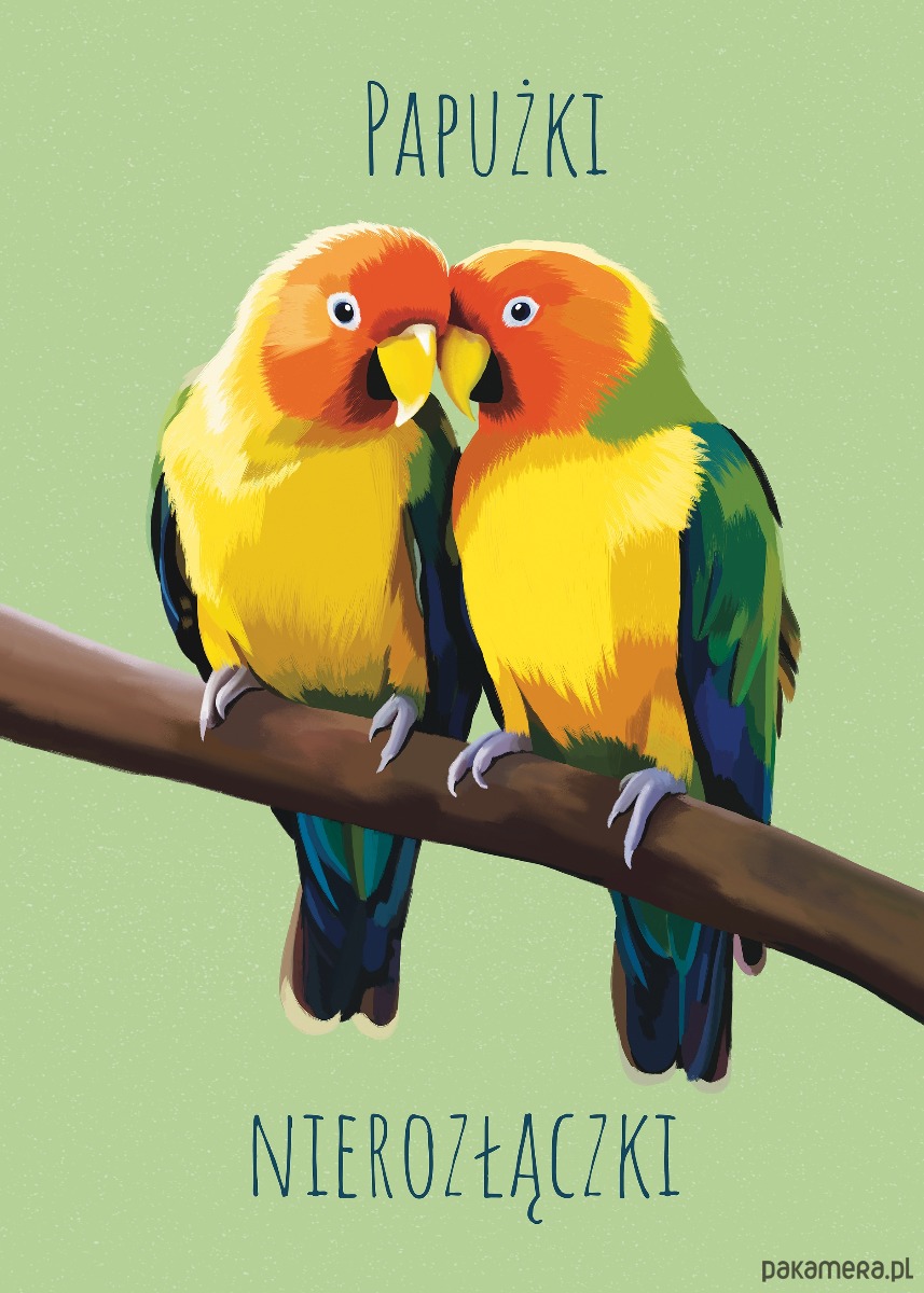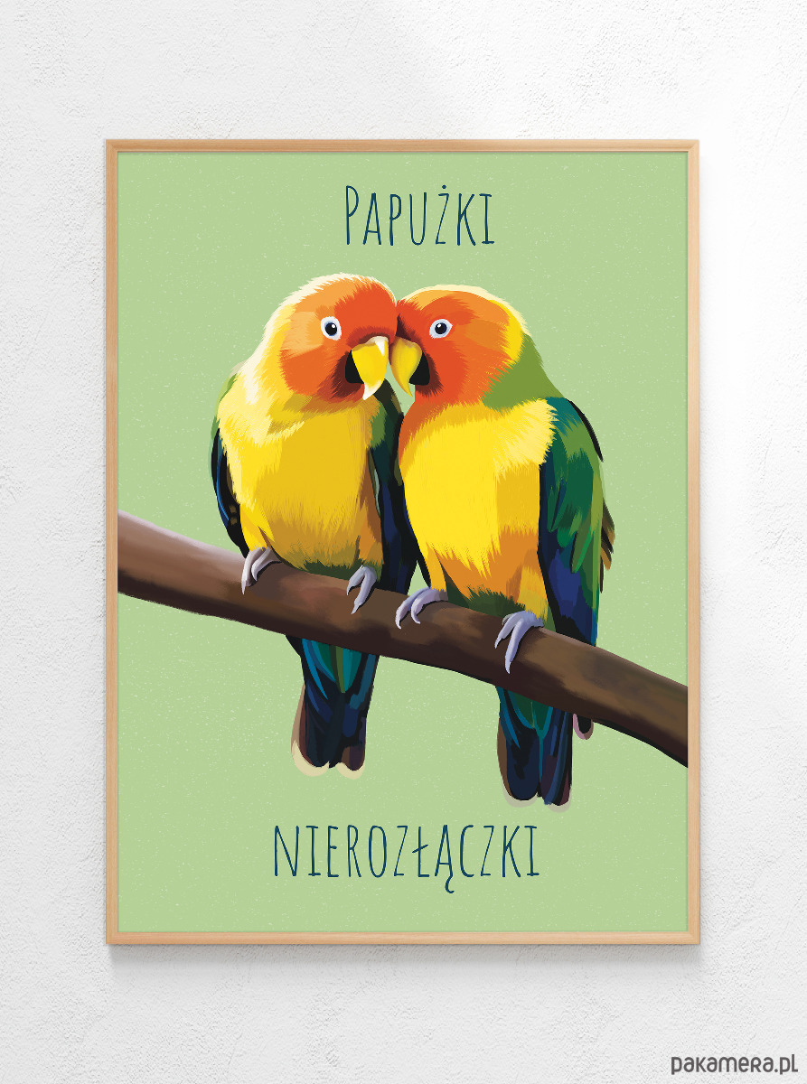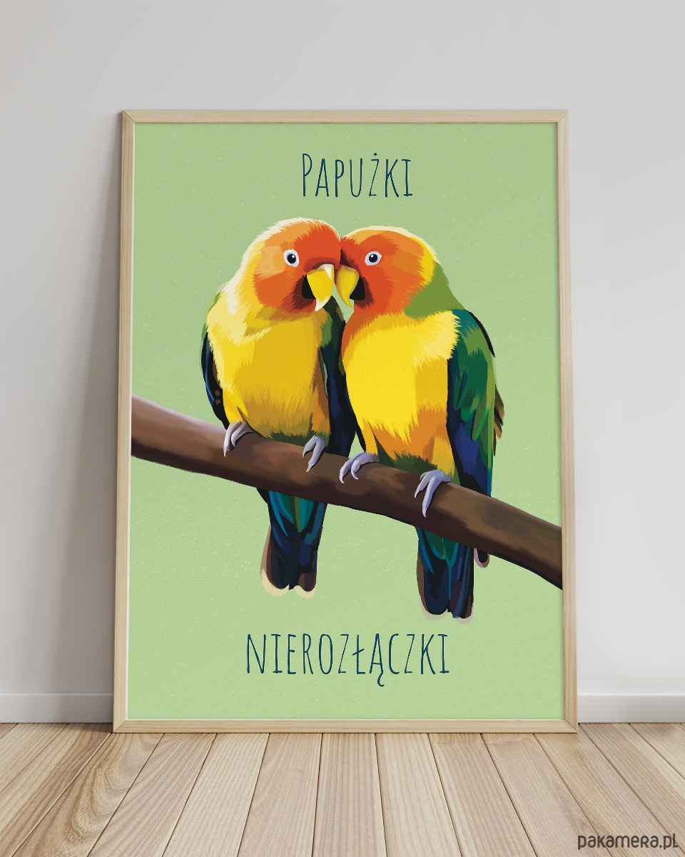 Romantyczny plakat przedstawiający dwie papużki nierozłączki – symbol miłości i wierności. Pełen ciepła i kolorów, idealny jako walentynkowy akcent lub wyjątkowy prezent dla ukochanej osoby.