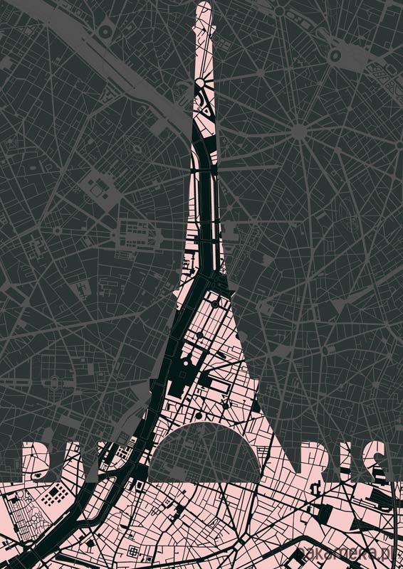 Plakat przedstawiający wieżę Eiffla wpisaną w plan Paryża. W tle widoczna jest część miasta skoncentrowana po obu brzegach rzeki Sekwany, pomiędzy wzgórzem i dzielnicą Montmartre na północy, dworcem kolejowym Montparnasse na południu, Laskiem Bulońskim na zachodzie i Placem Bastylii na wschodzie.
