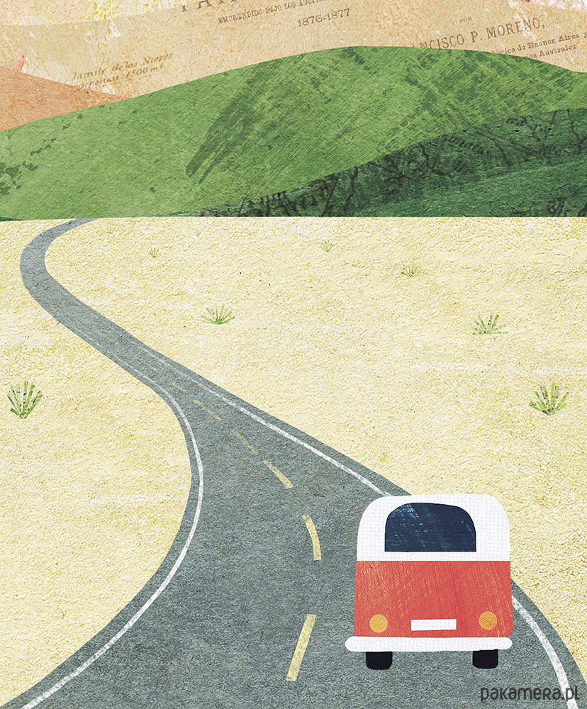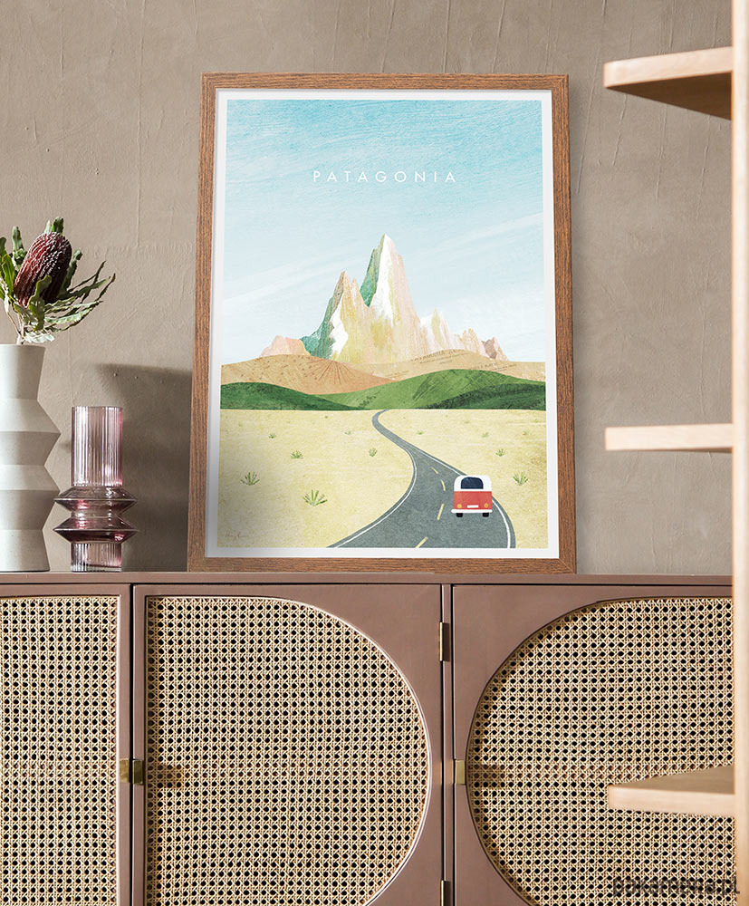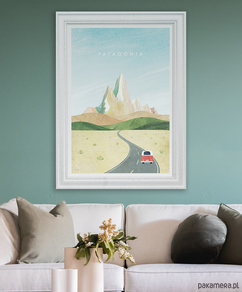 Plakat podróżniczy "Patagonia" przedstawia czerwony samochód zmierzający w stronę majestatycznych szczytów skalnych - Cerro Torre. Dla każdego podróżnika i marzyciela dekoracja obowiązkowa.