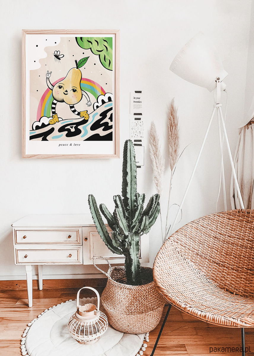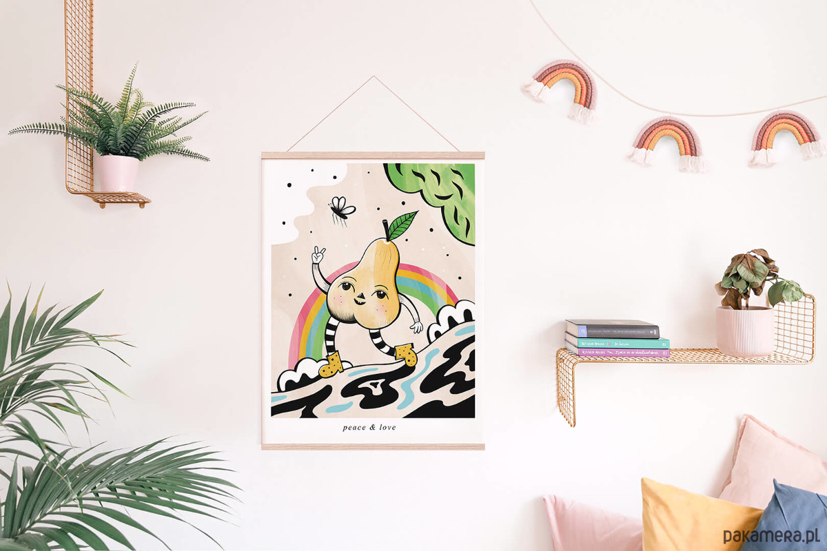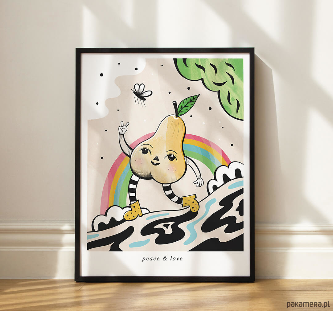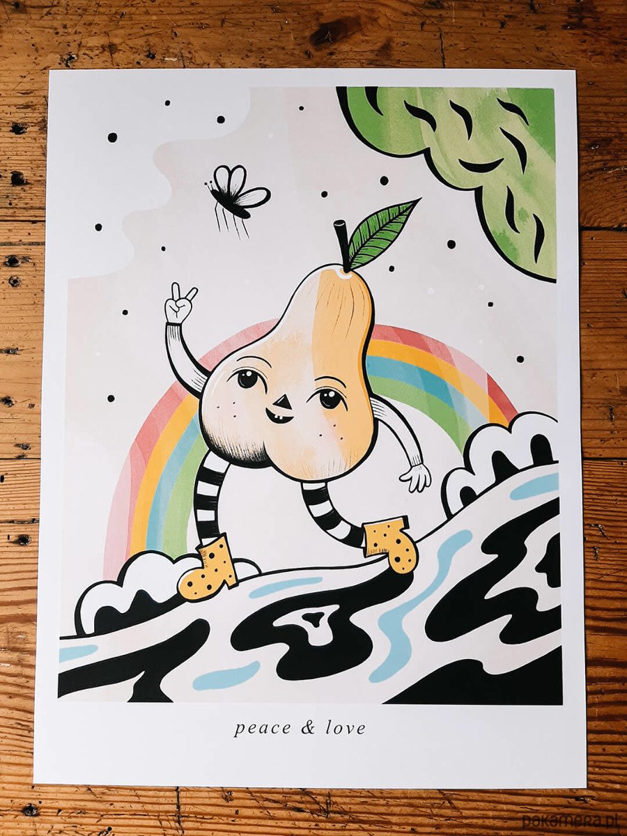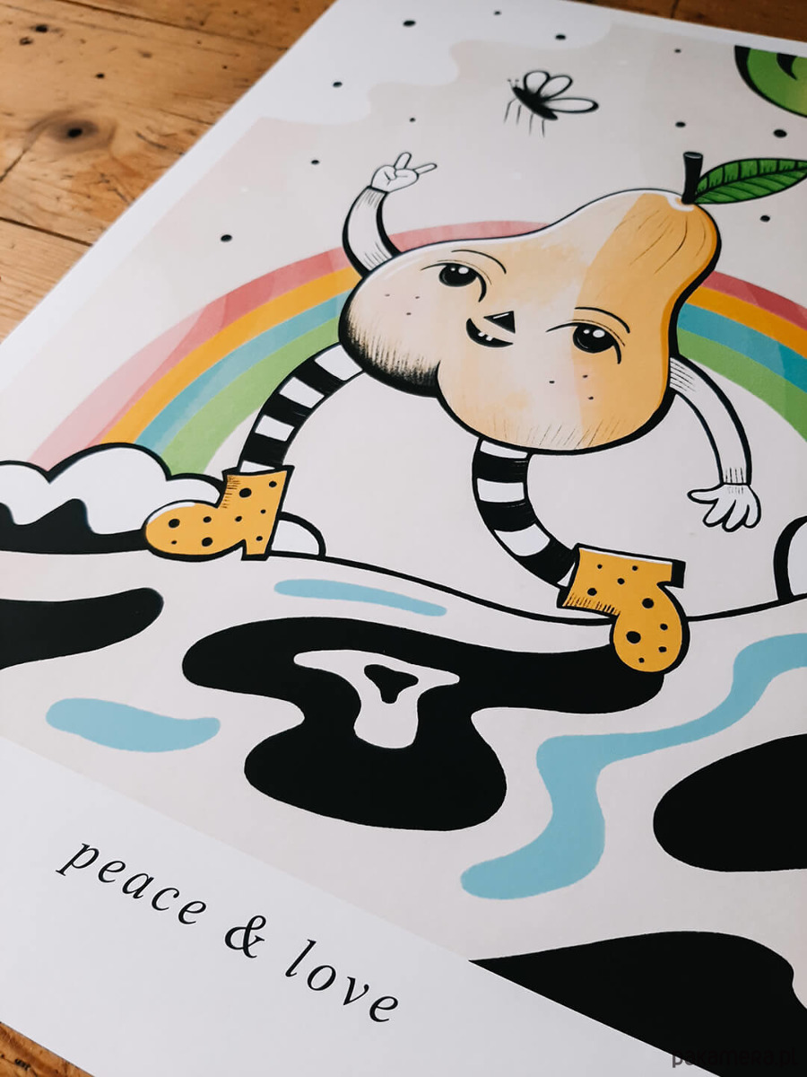 – plakat z napisem „peace and love” i autorską grafiką wykonaną w technice tradycyjnej (akwarela) i cyfrowej