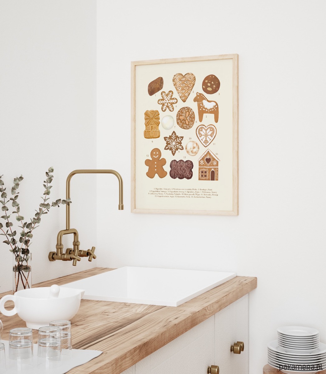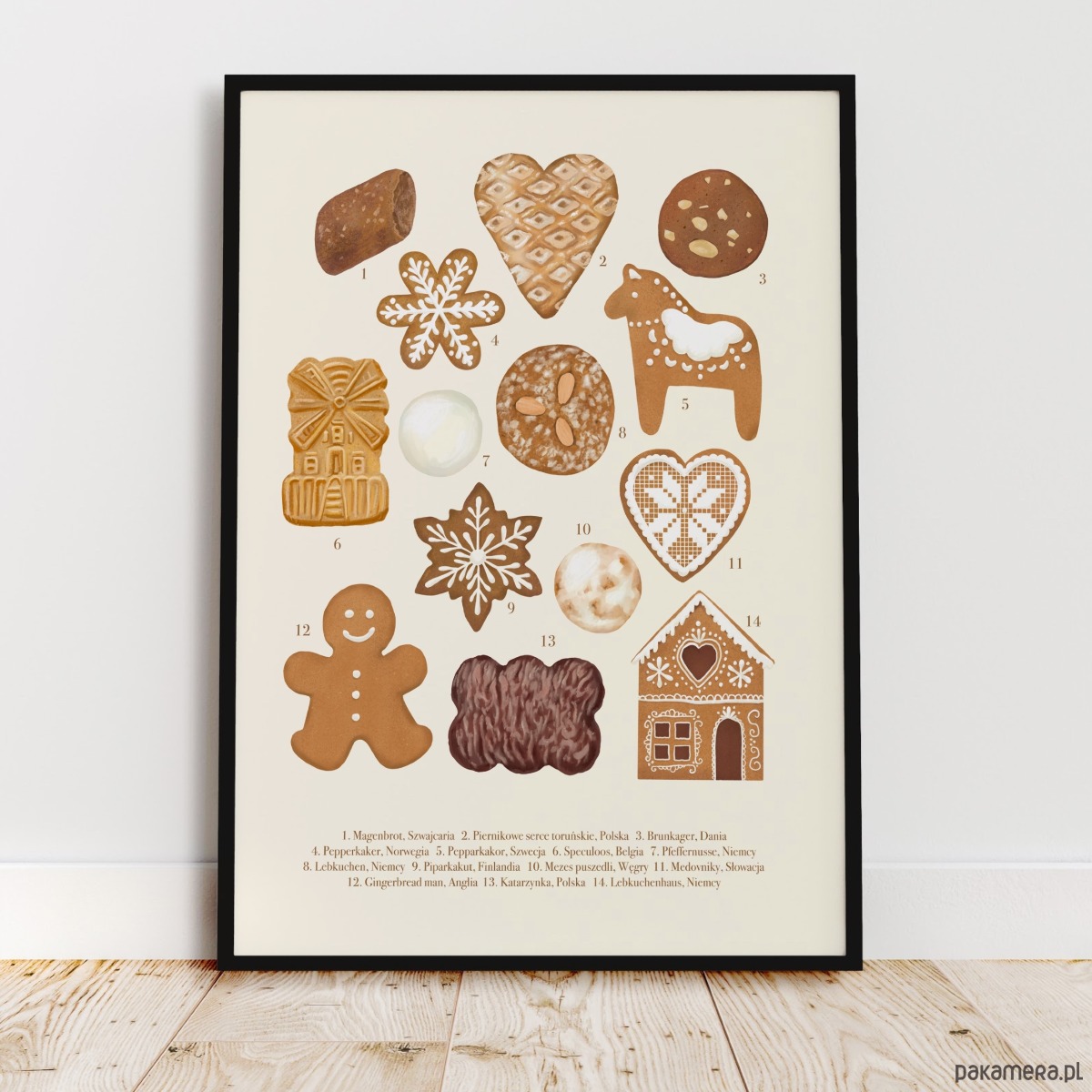 Ten plakat aż pachnie przyprawami korzennymi! Ilustracja przedstawia kolekcję pierniczków, charakterystycznych dla różnych państw. Znajdziemy tu między innymi niemieckie Lebkuchen, szwedzkie Peperkakor i polską katarzynkę.