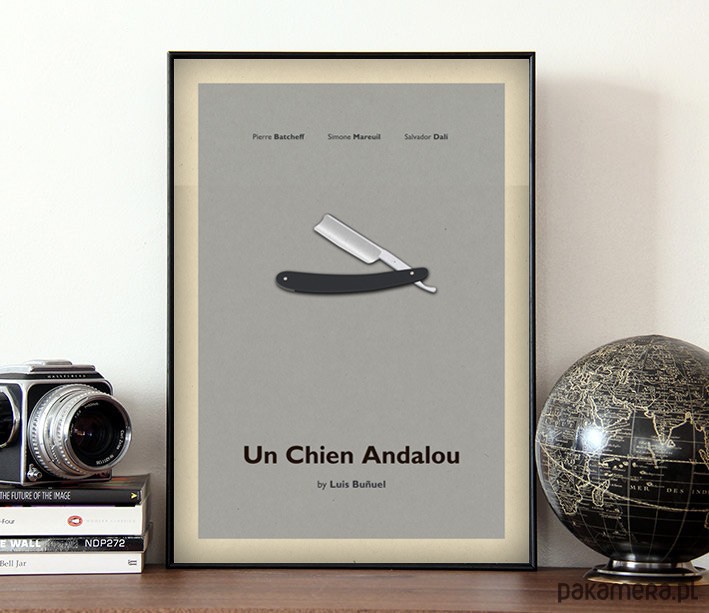 Plakat z autorską grafiką inspirowaną filmem Pies anadaluzyjski (Un chien anadalou) w reżyserii Luisa Bunuela, przy współpracy z Salvadorem Dalim.