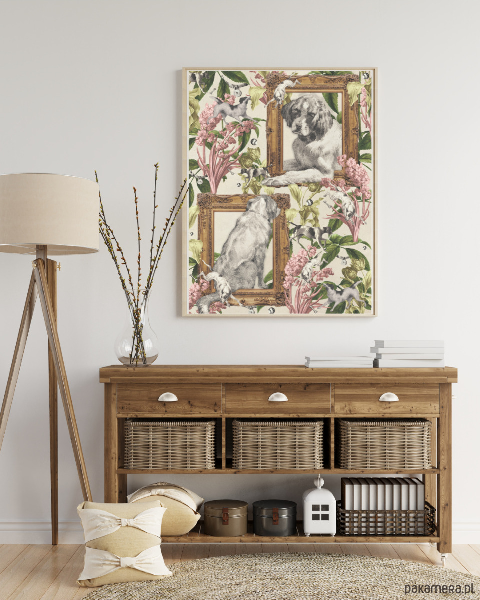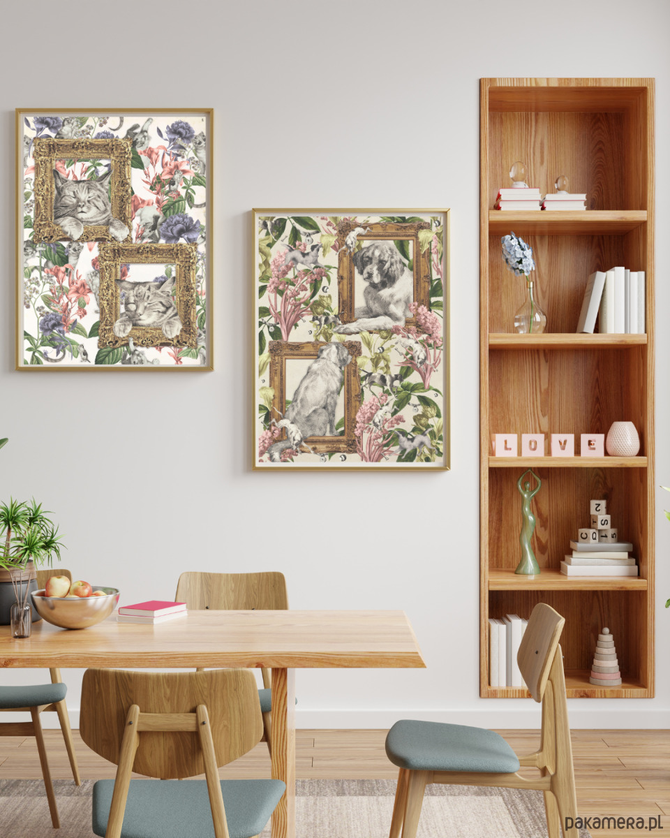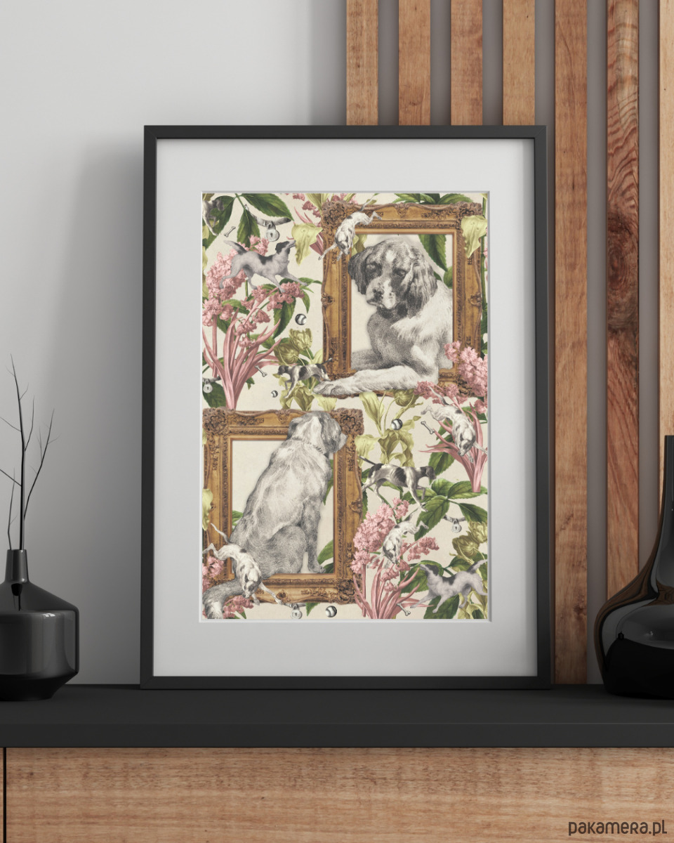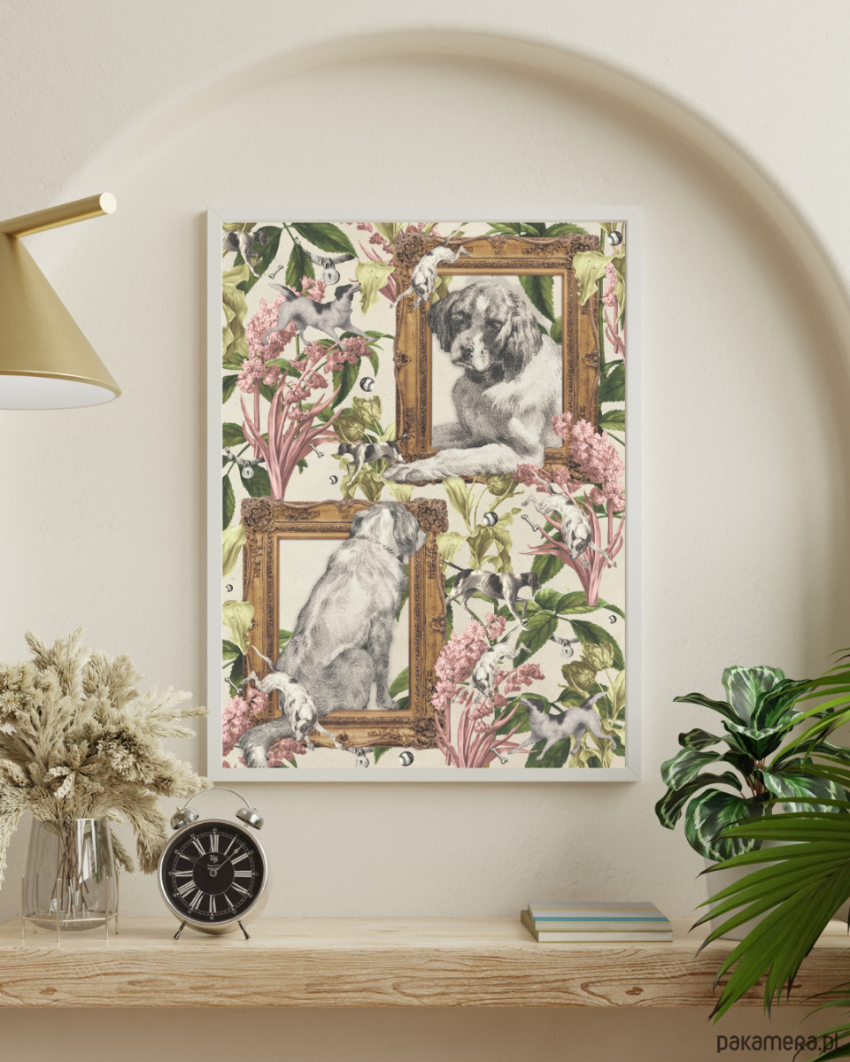 Złote ramki, botaniczne detale i psie spojrzenia pełne spokoju — dwa czworonożne duszki zamknięte w ramach, jak rodzinne portrety, które nigdy nie wychodzą z mody.