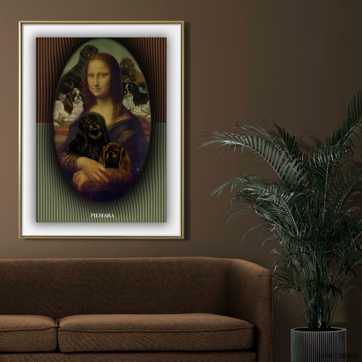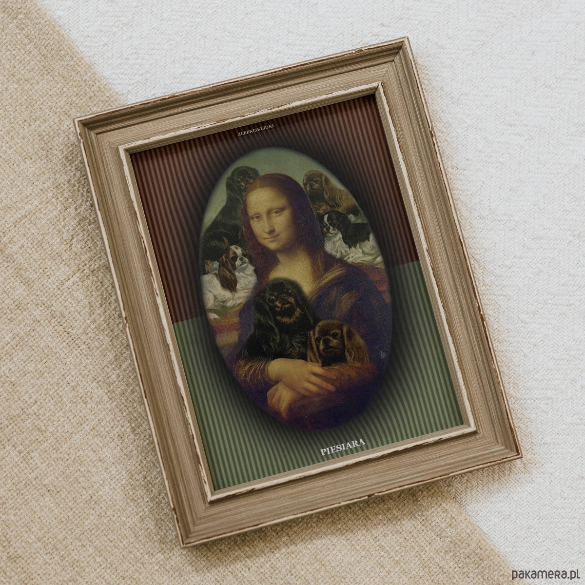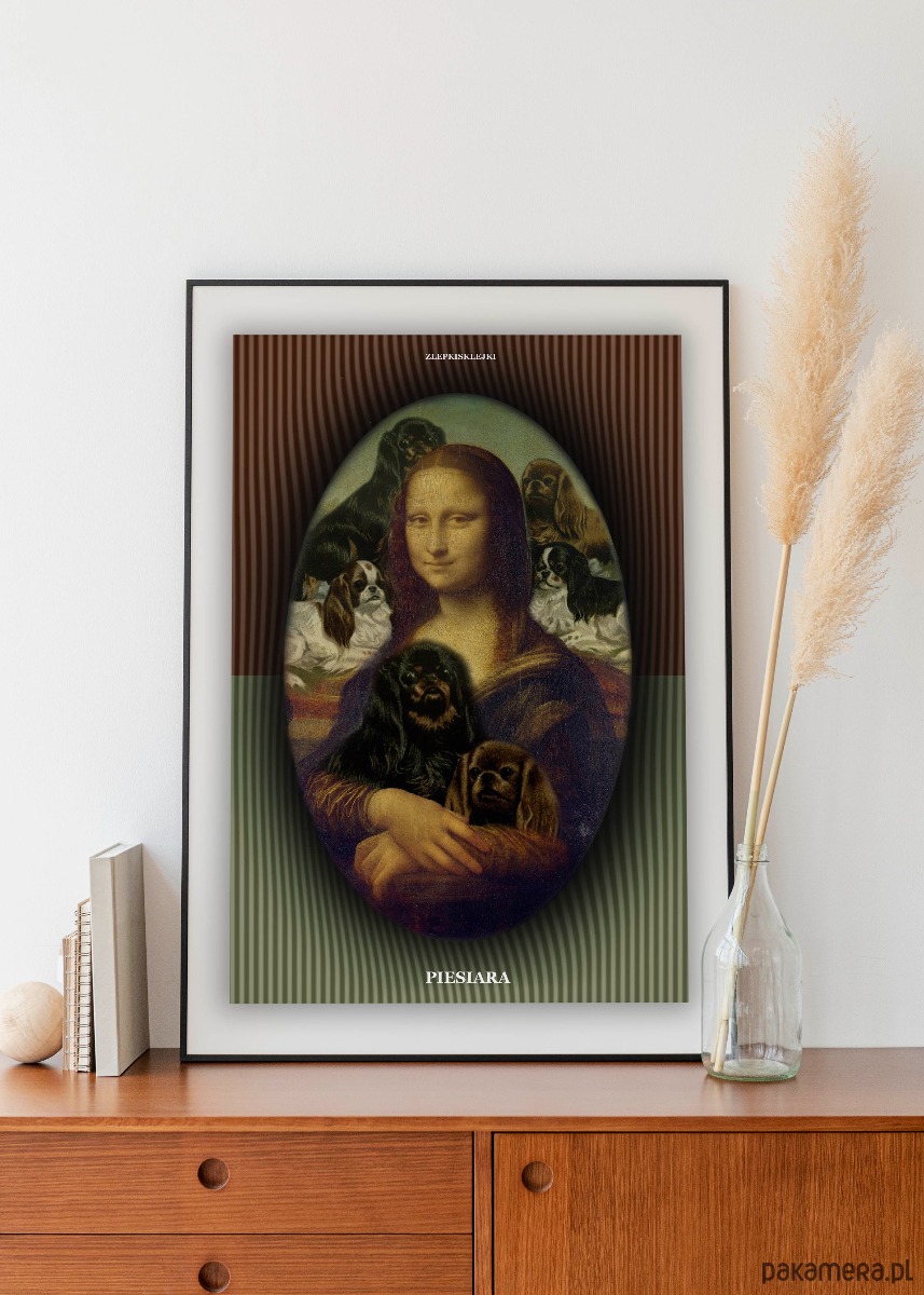 Ten plakat to hołd dla prawdziwych królowych i królów psich serc — tych, którzy potrafią otaczać się słodkimi pyszczkami jak Mona Lisa swoim spokojem.