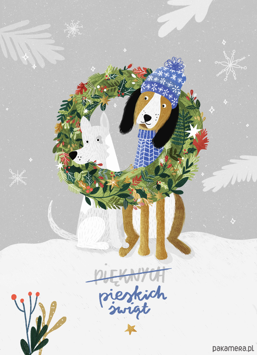 Świąteczna para psiaków otoczona zielonym wieńcem czeka na nowy dom.