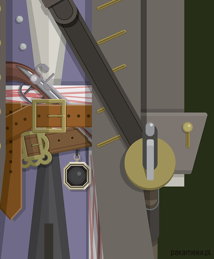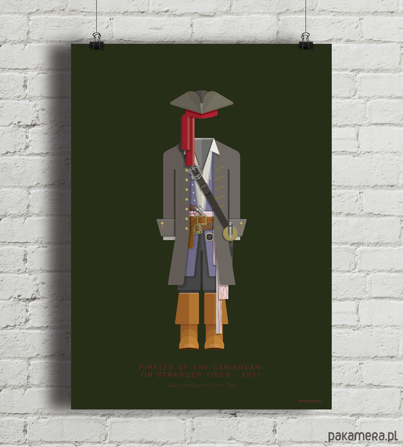 Plakat z autorską grafiką inspirowaną filmem "Piraci z Karaibów: Na Nieznanych Wodach" (Pirates of the Caribbean: On Stranger Tides), reż. Rob Marshall. Pochodzi z serii "Cinema Costumes" (Kostiumy kinowe) i przedstawia strój Jacka Sparrowa.
