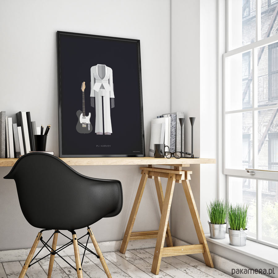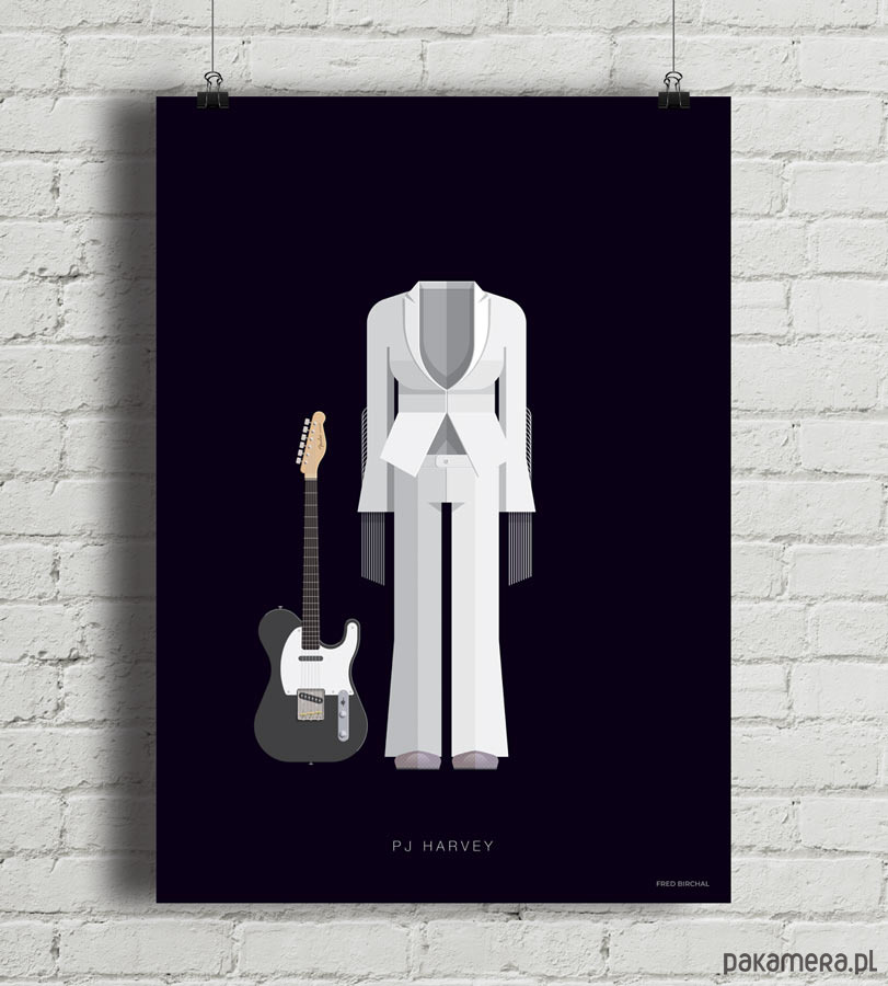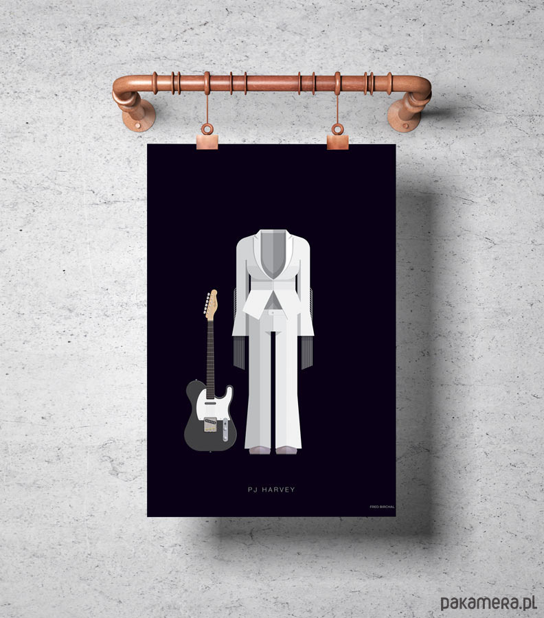 Plakat z autorską grafiką inspirowany brytyjską wokalistką i multiinstrumentalistką PJ Harvey. Pochodzi z serii "Kostiumy muzyczne" i przedstawia biały skafander, w którym artystka wystąpiła w teledysku do piosenki "This is Love".