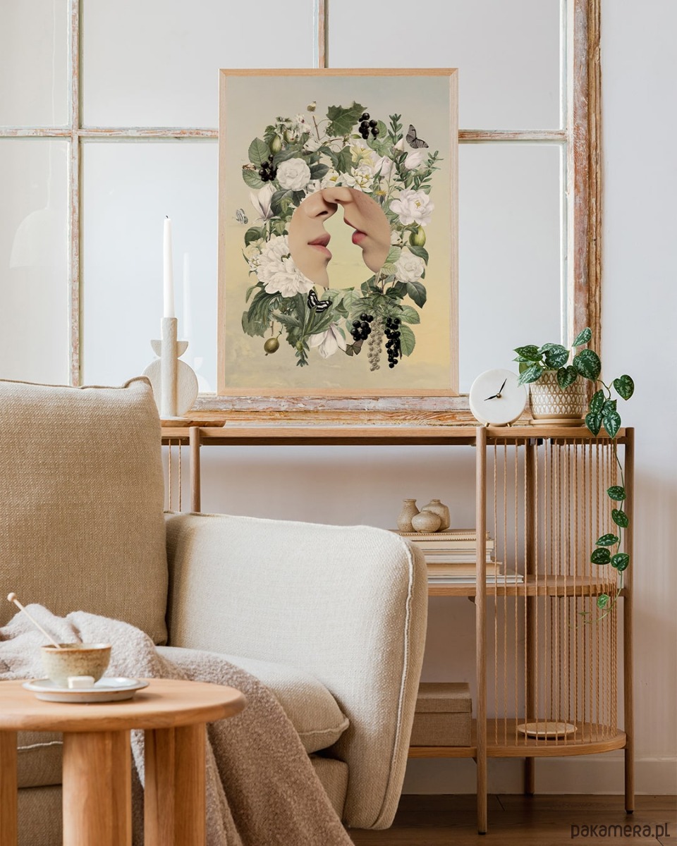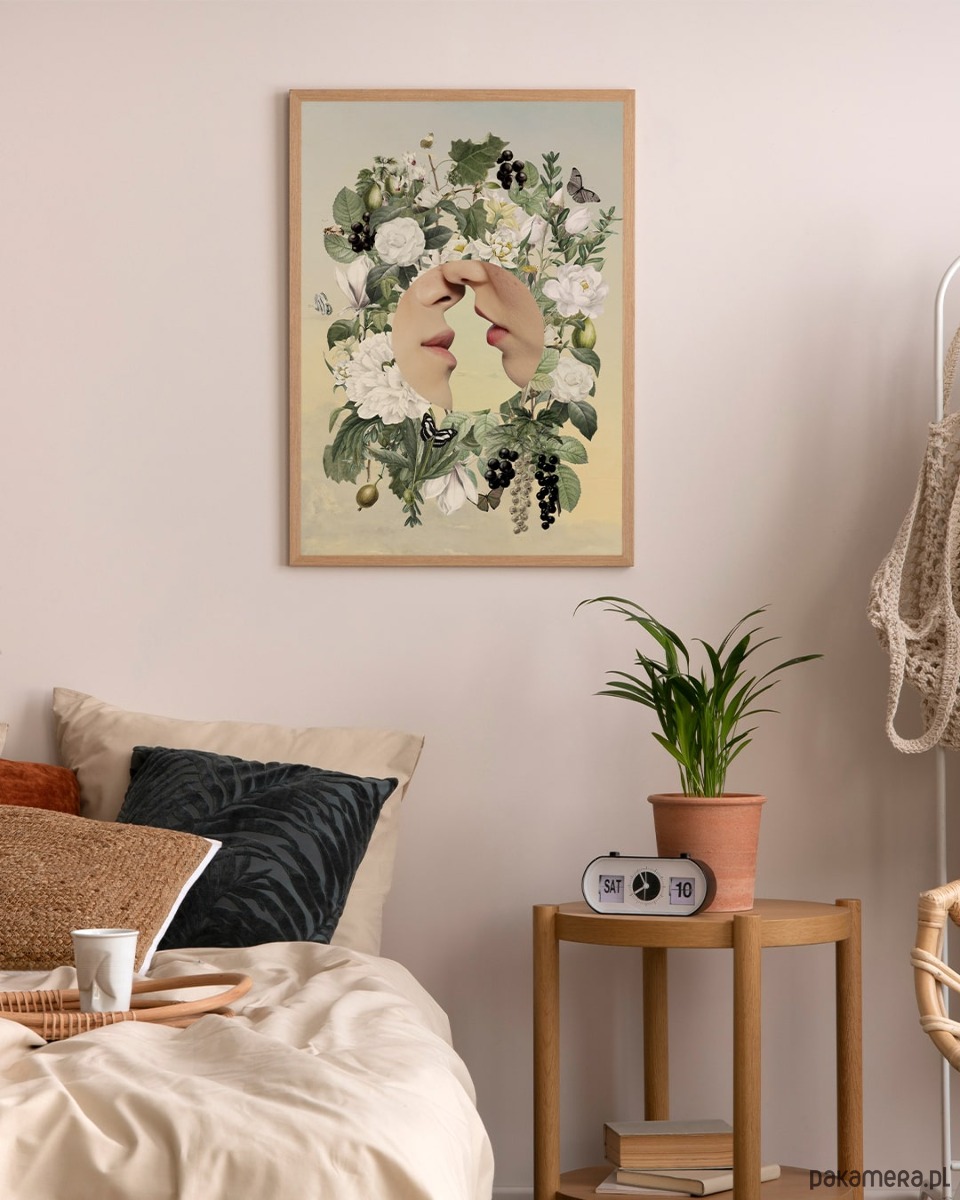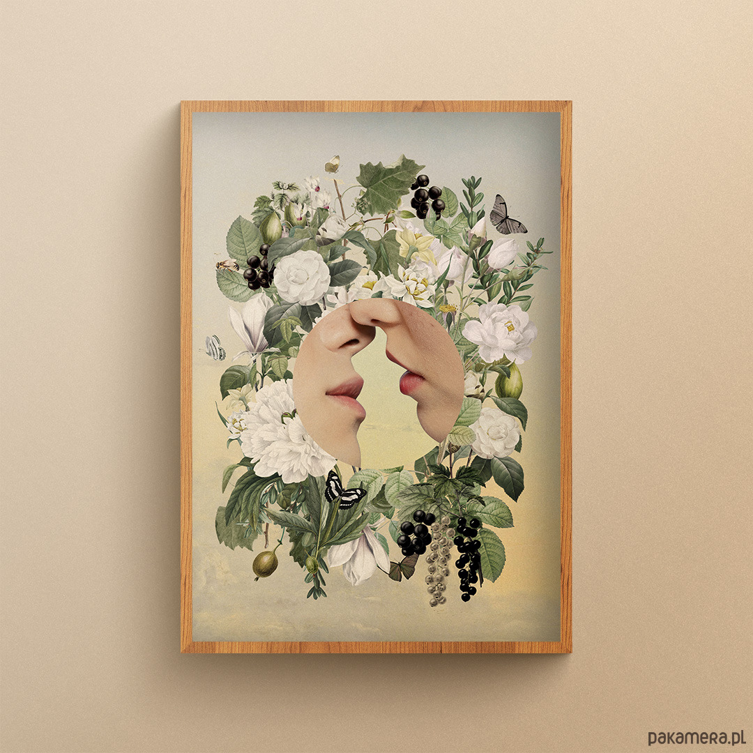„Pocałunek” to zmysłowy kolaż łączący romantyzm ludzkich emocji z bogactwem natury — twarze splecione w pocałunku otulają kwiaty, liście i owoce. Idealna dekoracja dla miłośników sztuki botanicznej i subtelnych, surrealistycznych kompozycji.