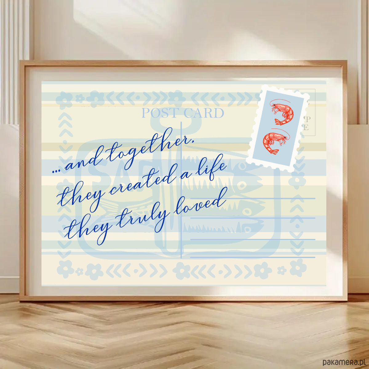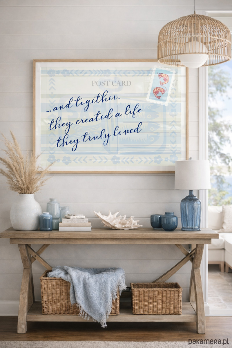 Ten plakat działa jak kadr z wakacji, do których chcesz wracać codziennie. Lekko nostalgiczny, trochę jak znaleziona kartka pocztowa, ale z historią, którą piszesz już sama. Delikatna kompozycja i miękka forma typografii tworzą spokojne tło dla jednego zdania, które zostaje na dłużej. To nie jest grafika, która krzyczy. Ona raczej „siada” w przestrzeni i robi klimat. Świetnie odnajduje się w jasnych wnętrzach, wśród naturalnych materiałów, drewna i miękkich tekstyliów. Wnosi luz, światło i taką niewymuszoną lekkość — trochę jak dom blisko wody.