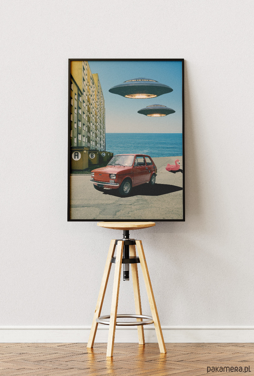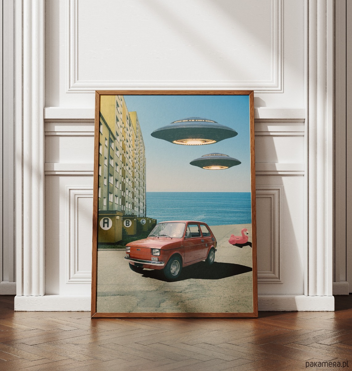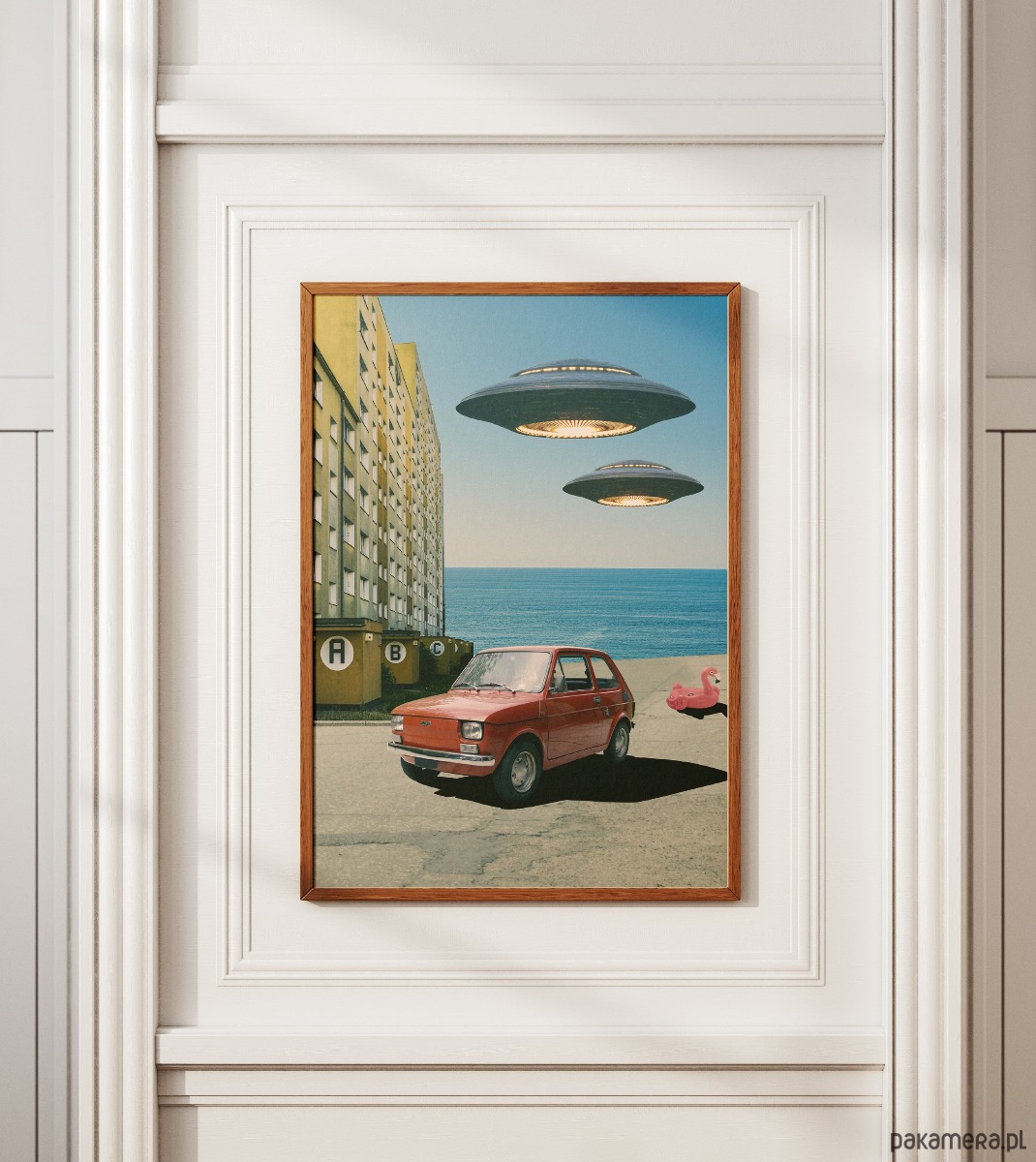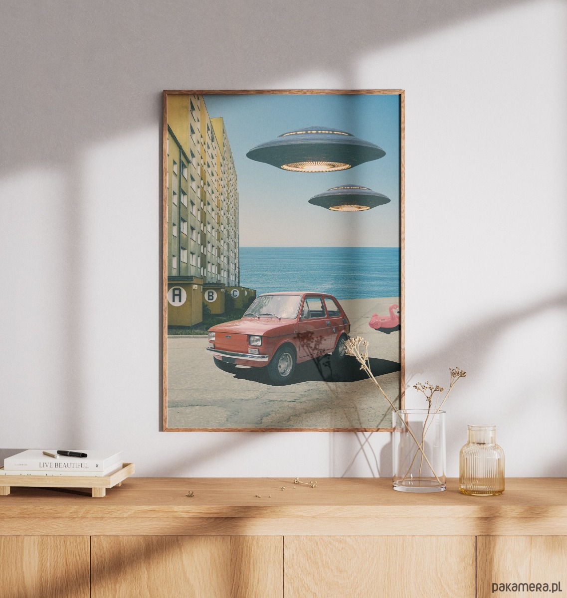 Plakat „Pocztówka z wakacji” – surrealistyczny kolaż, w którym klasyczny Fiat 126p parkuje nad morzem, a nad blokowiskiem unoszą się tajemnicze UFO. Scena balansuje między nostalgią PRL-u a fantazją rodem z filmów science fiction – zwyczajny urlop zamienia się w opowieść nie z tej ziemi.