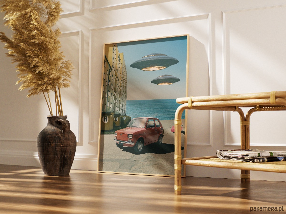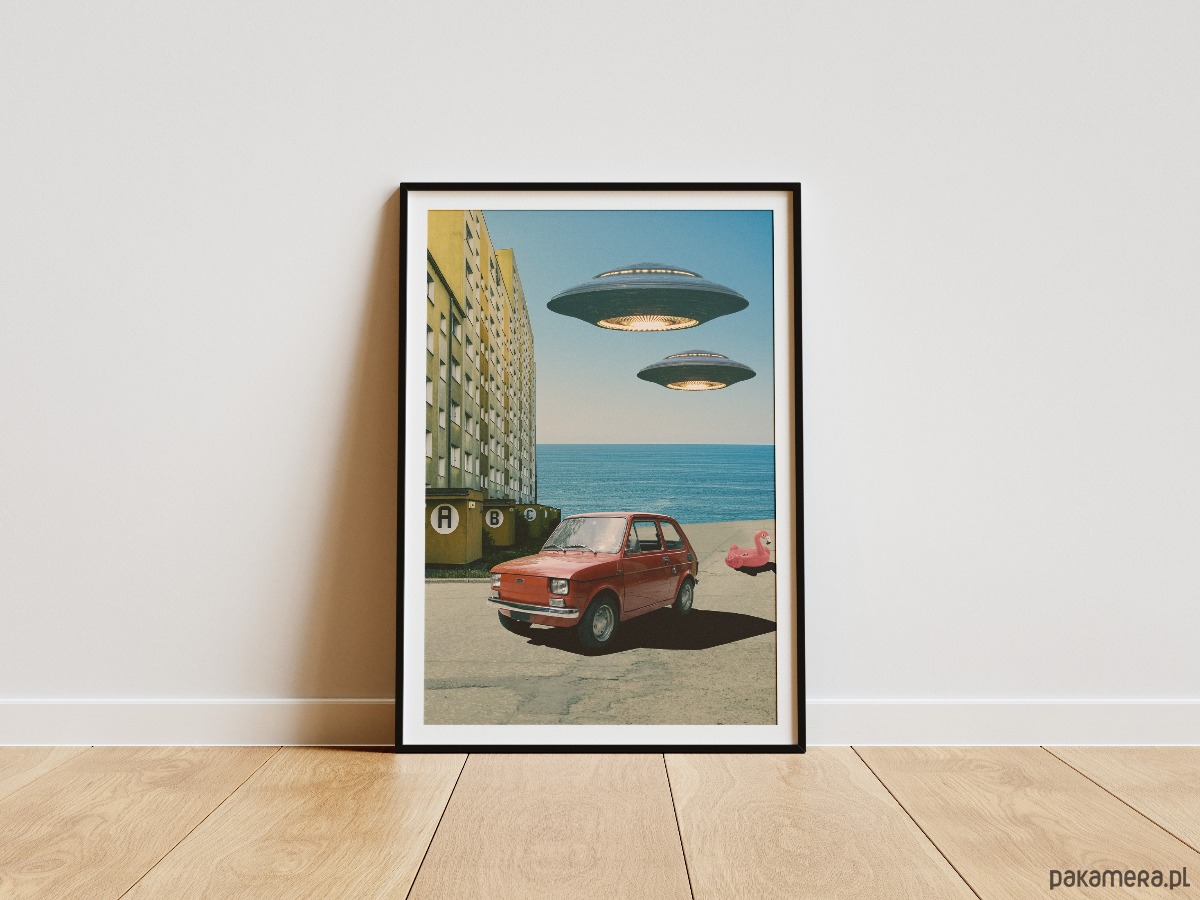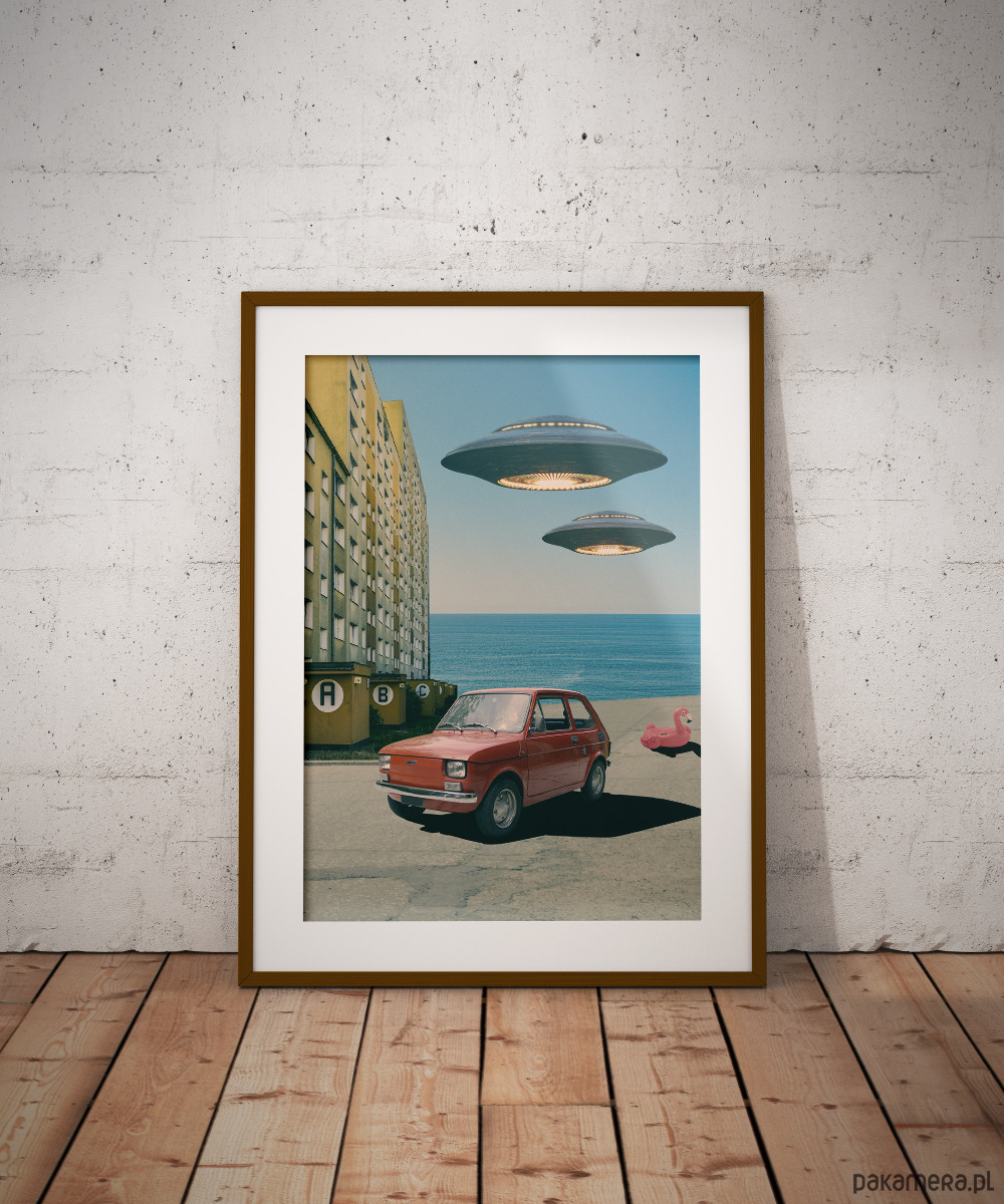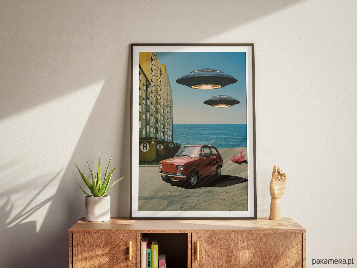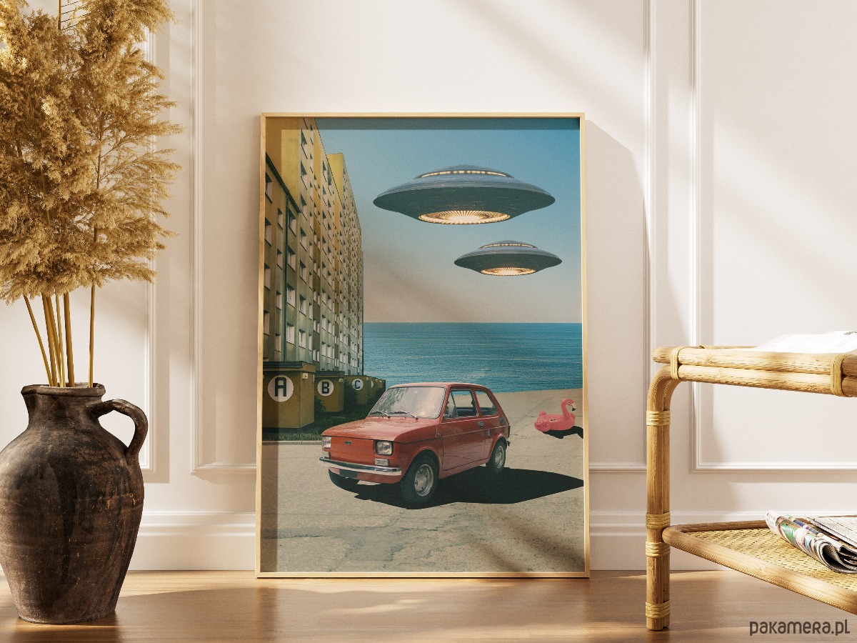 Plakat „Pocztówka z wakacji” – surrealistyczny kolaż, w którym klasyczny Fiat 126p parkuje nad morzem, a nad blokowiskiem unoszą się tajemnicze UFO. Scena balansuje między nostalgią PRL-u a fantazją rodem z filmów science fiction – zwyczajny urlop zamienia się w opowieść nie z tej ziemi.