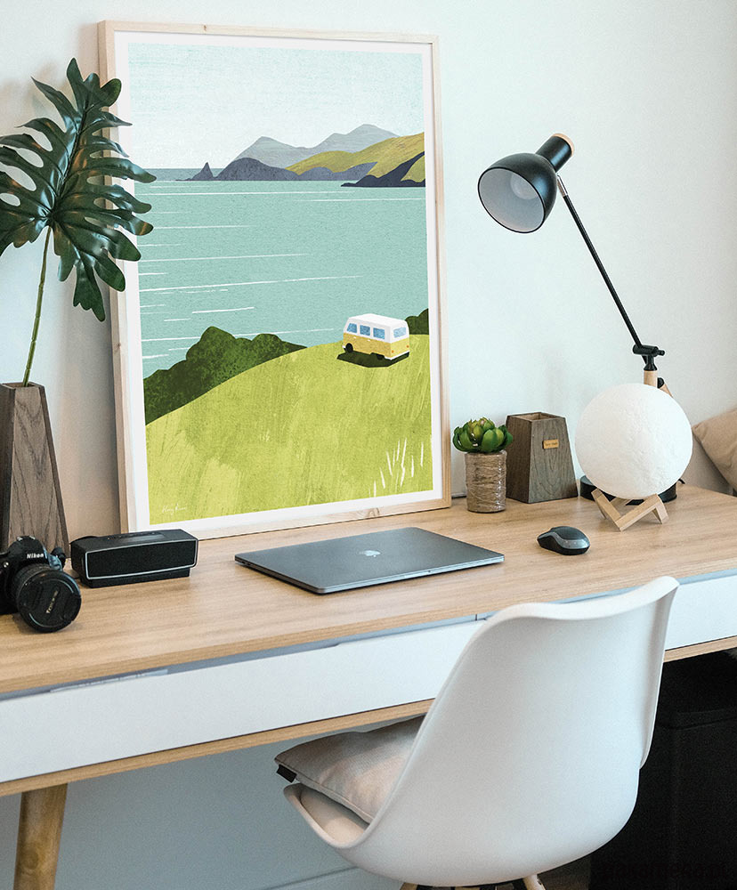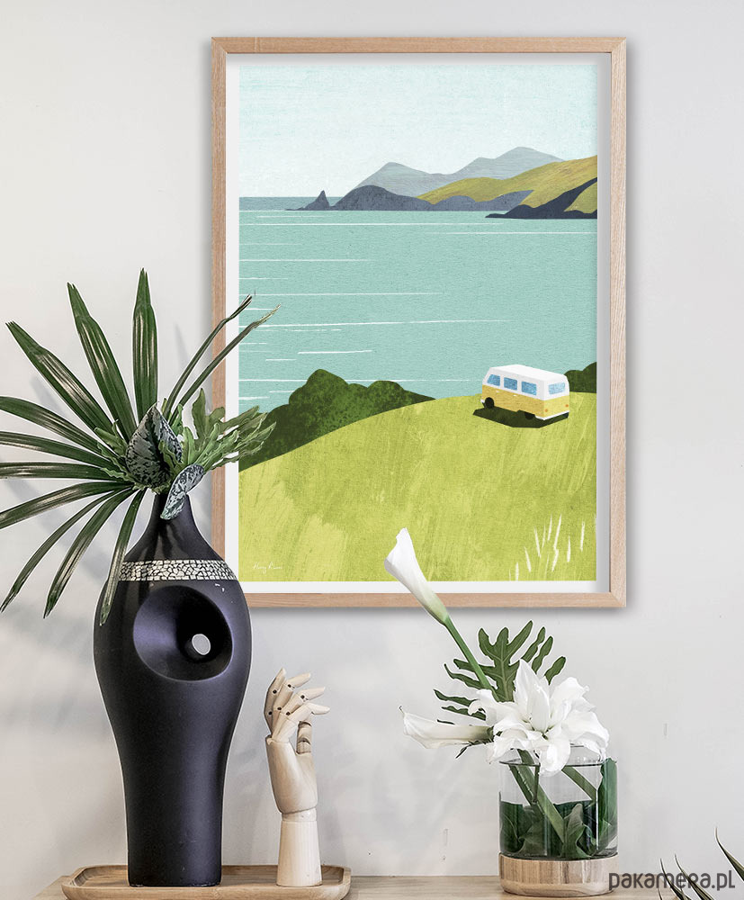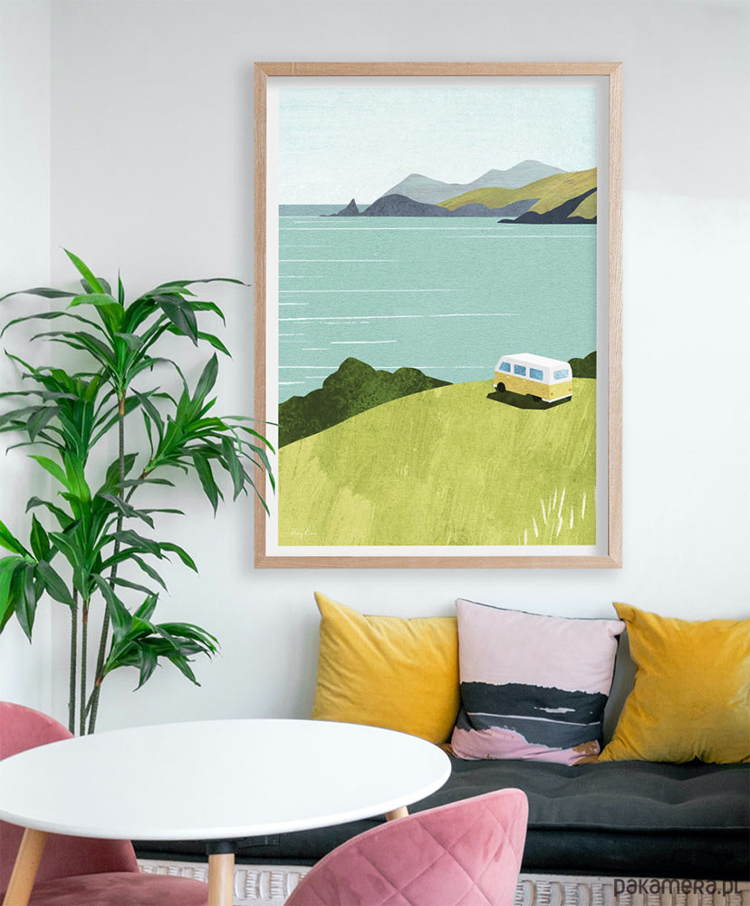 Plakat pełen zielonej energii. Grafika z kamperem zachęca do wyruszenia w drogę i odbycia niesamowitej przygody. Idealna dekoracja do mieszkania, domu i kampera.