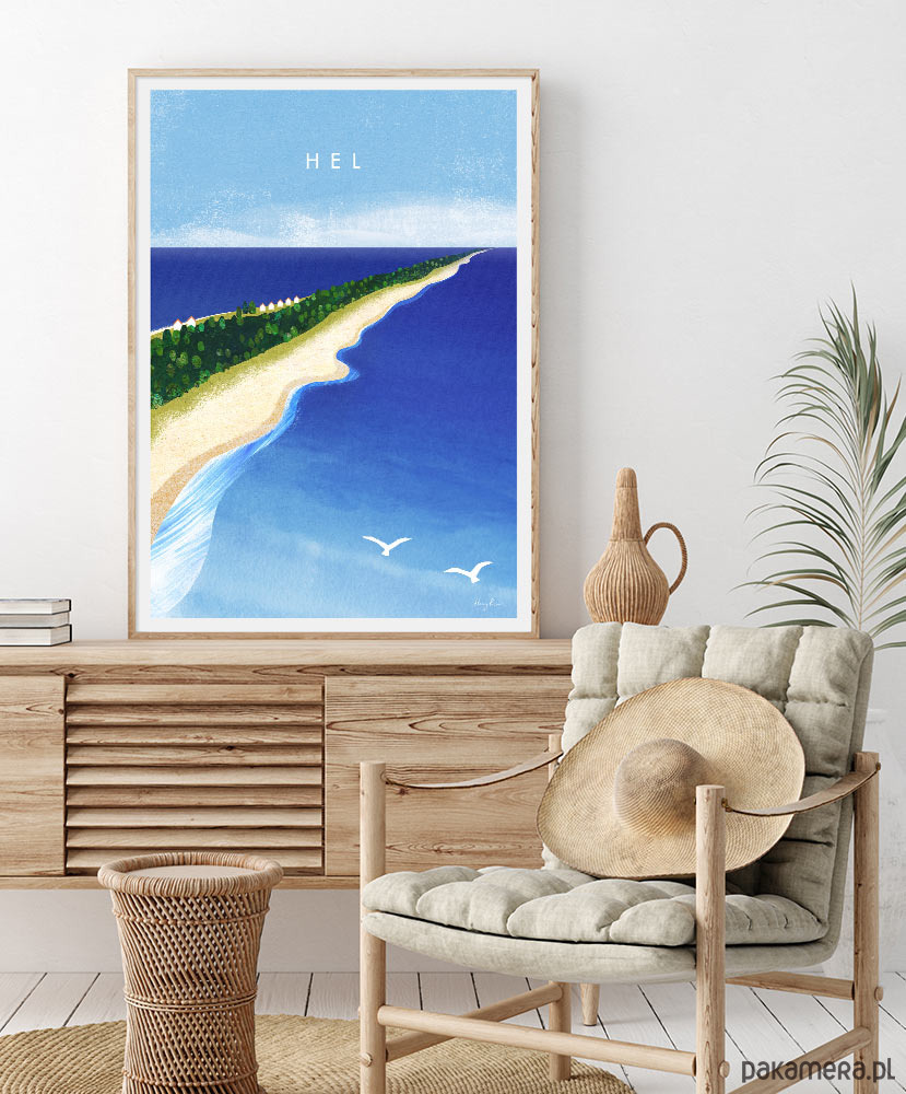 Plakat "Hel - z lotu ptaka" to piękna, morska dekoracja do każdego wnętrza. Intensywnie niebieska grafika świetnie sprawdzi się zarówno w domu, jak i w dobrze urządzonym pensjonacie.