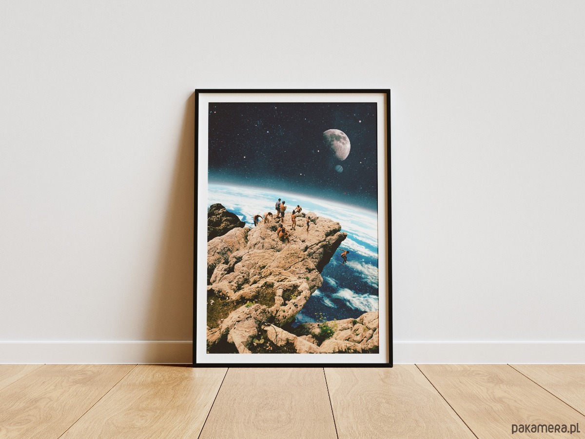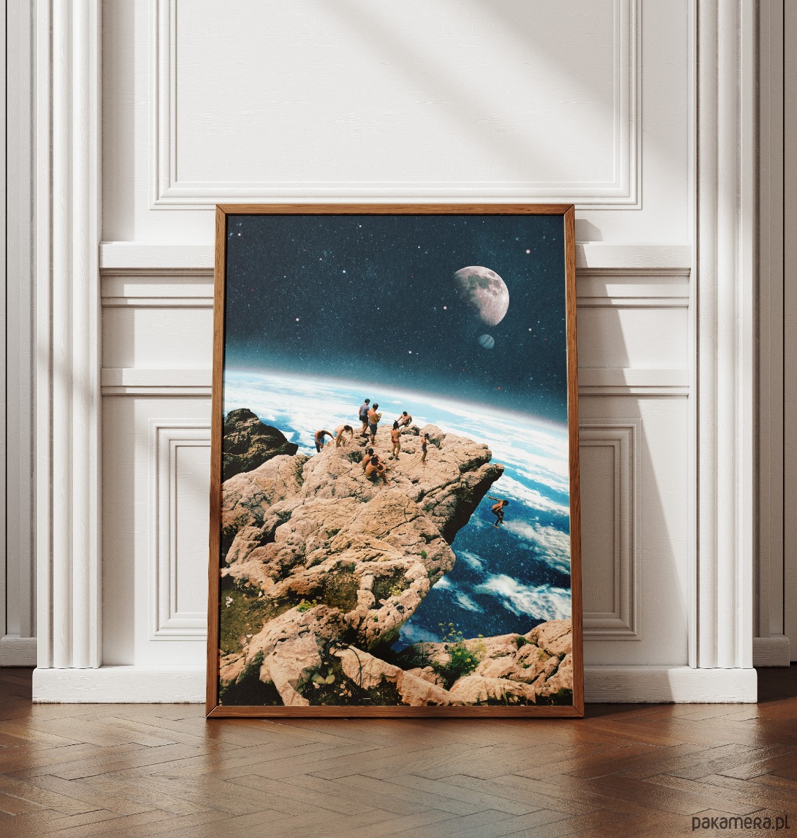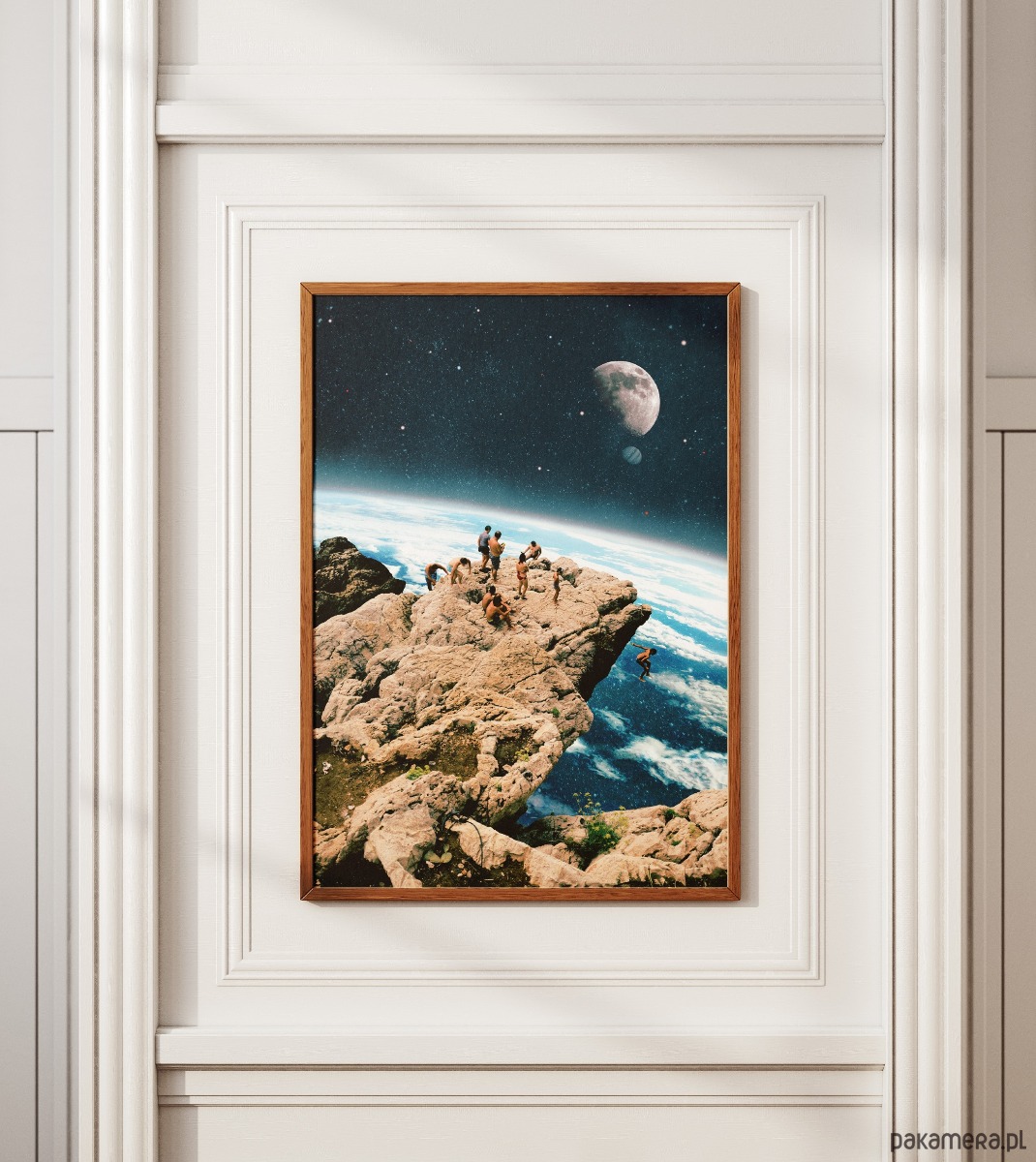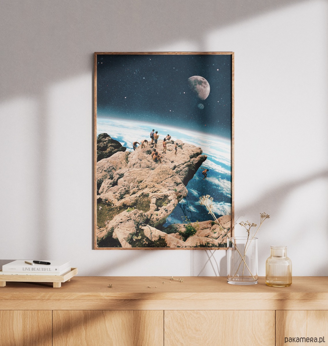 Minimalistyczny kolaż o surrealistycznym charakterze przedstawiający grupę ludzi stojących na skalistym szczycie ponad Ziemią, z widokiem na kosmos i księżyc. Połączenie motywów natury i przestrzeni kosmicznej tworzy wizję przekraczania granic i ludzkiej ciekawości wobec nieznanego. Kompozycja utrzymana w stonowanej, lekko retro kolorystyce, nadaje całości klimatu vintage science-fiction.
