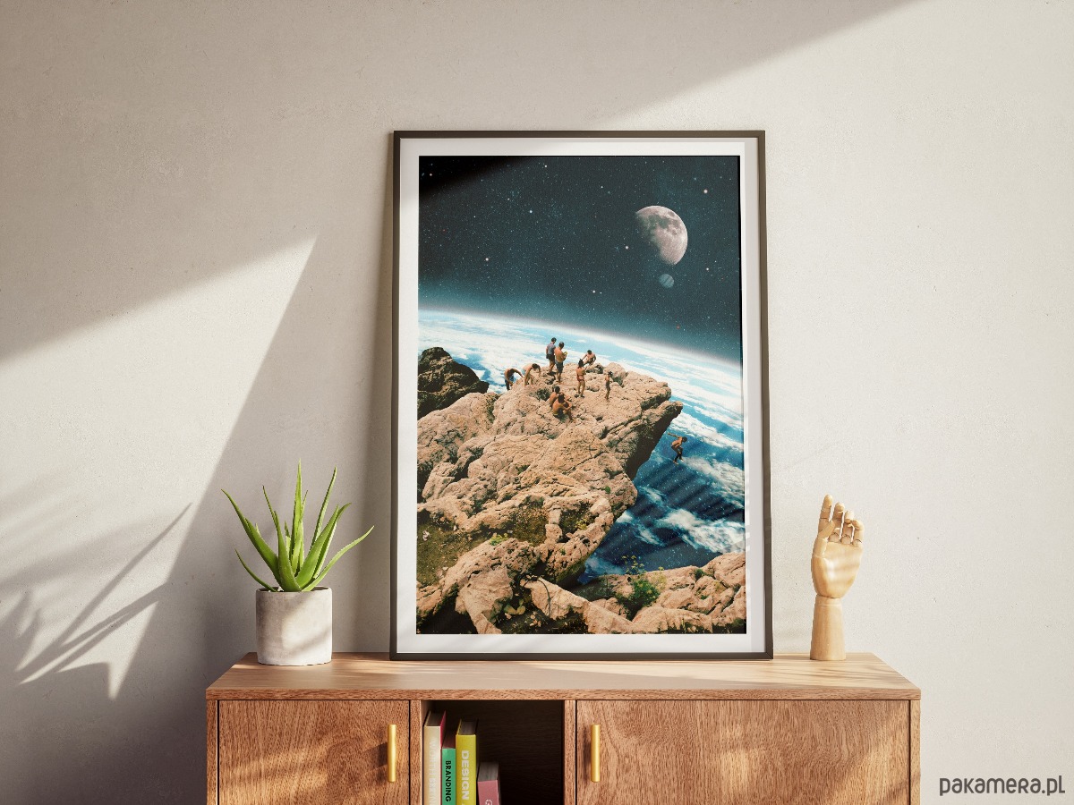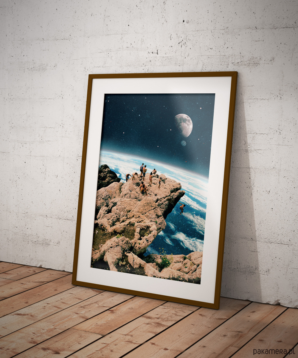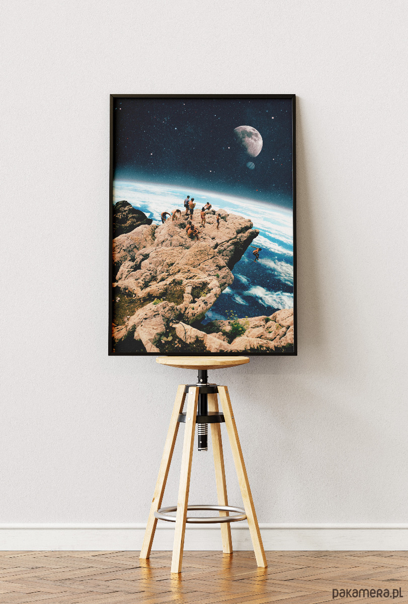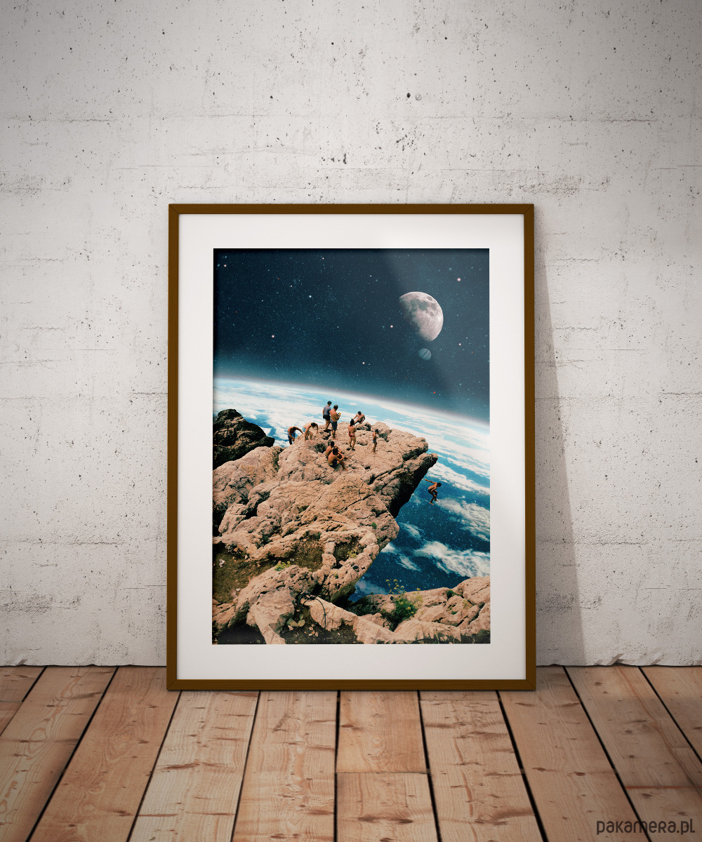 Minimalistyczny kolaż o surrealistycznym charakterze przedstawiający grupę ludzi stojących na skalistym szczycie ponad Ziemią, z widokiem na kosmos i księżyc. Połączenie motywów natury i przestrzeni kosmicznej tworzy wizję przekraczania granic i ludzkiej ciekawości wobec nieznanego. Kompozycja utrzymana w stonowanej, lekko retro kolorystyce, nadaje całości klimatu vintage science-fiction.