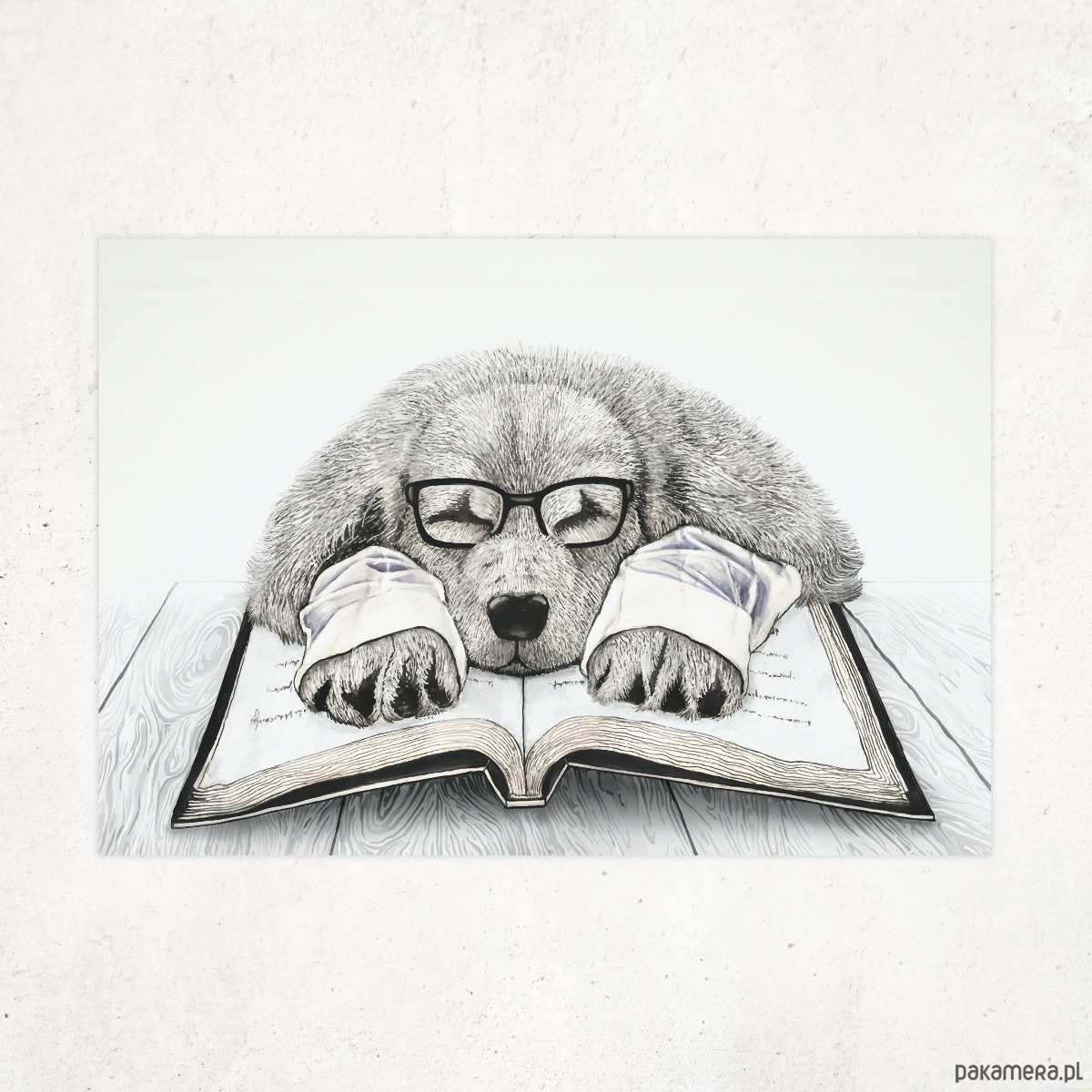 Plakat na podstawie autorskiej ręcznie rysowanej ilustracji. Portret śpiącego labradora w okularach. Obraz w czerni i bieli oraz w odcieniach szarości.