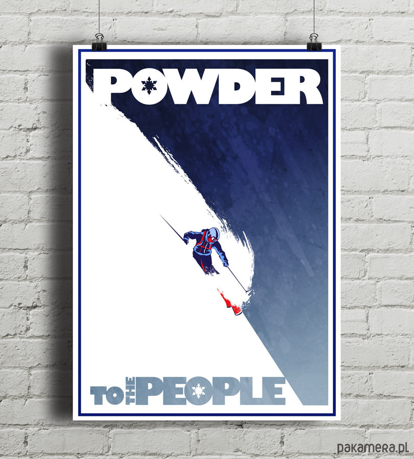 Autorski plakat w stylu vintage inspirowany narciarstwem alpejskim. Przedstawia narciarza zjeżdżającego po ośnieżonym stoku górskim oraz napis "Powder To The People". Stylizowany na plakaty podróżnicze z okresu XX-lecia międzywojennego.