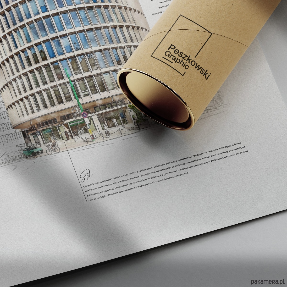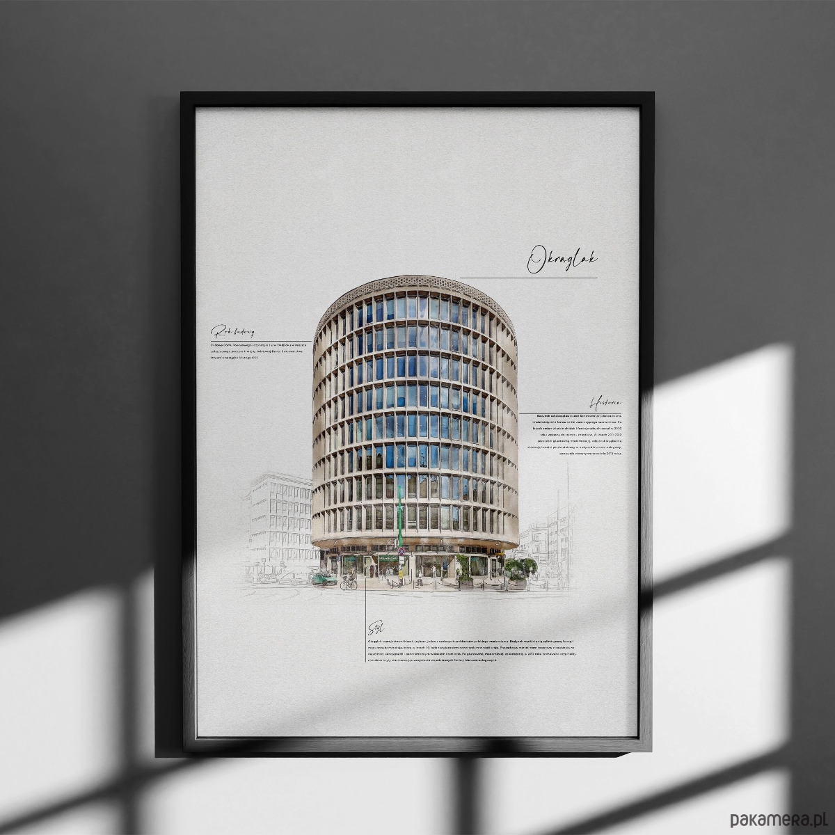 Autorski plakat przedstawiający Okrąglak – jedną z najbardziej rozpoznawalnych ikon modernistycznej architektury w Poznaniu. Charakterystyczna, cylindryczna bryła budynku została ukazana w eleganckiej, ilustracyjnej formie, łączącej precyzję rysunku architektonicznego z subtelną kolorystyką i minimalistycznym tłem.