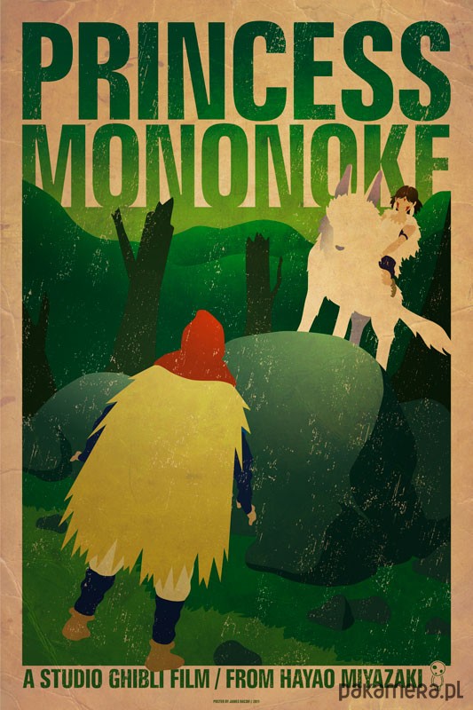 Plakat z autorską grafiką inspirowaną filmem "Księżniczka Mononoke" (Mononoke-hime), reż. Hayao Miyazaki.
