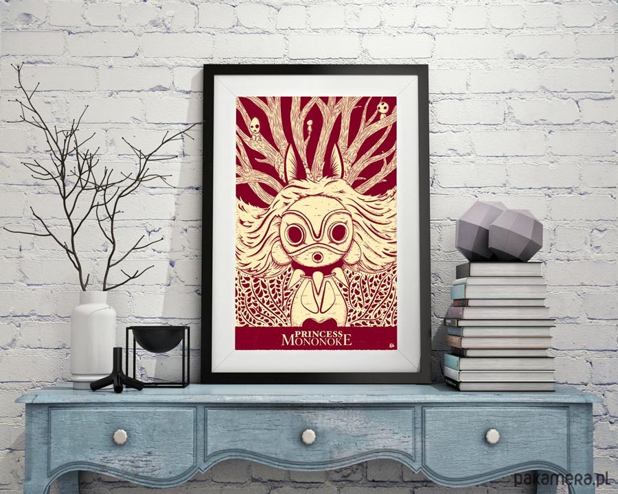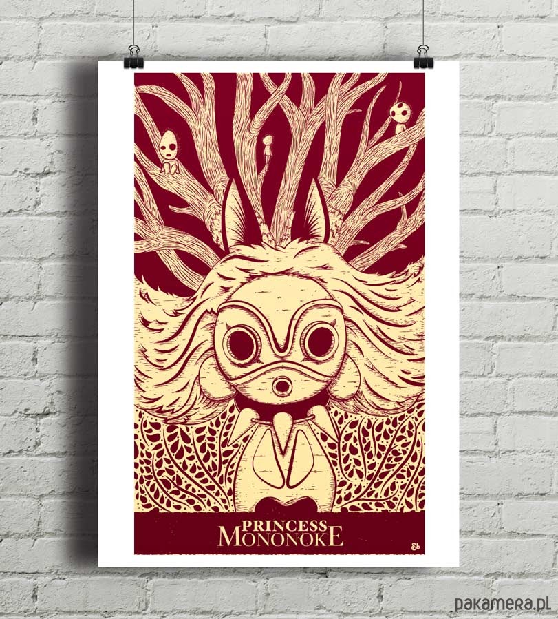 Plakat z autorską grafiką inspirowaną filmem Princess Mononoke w reżyserii Hayao Miyazakiego.