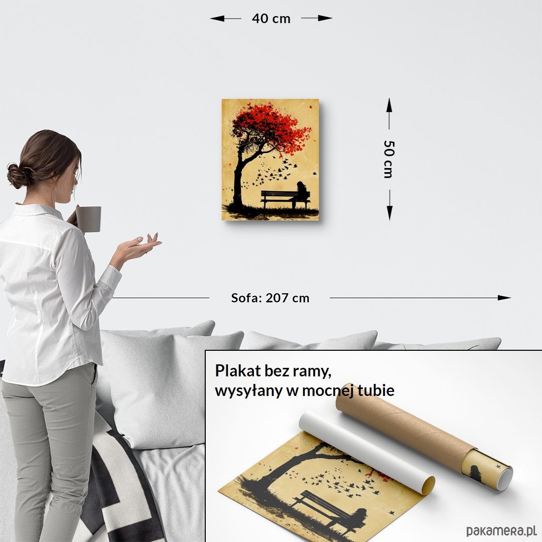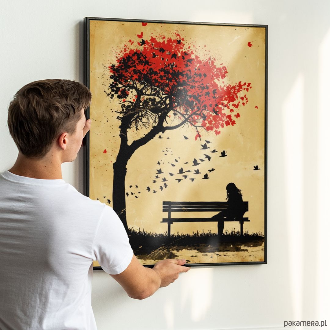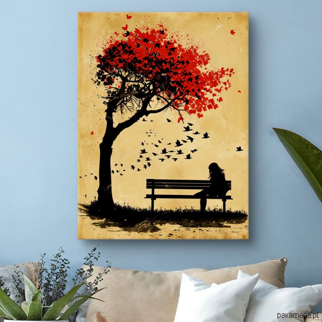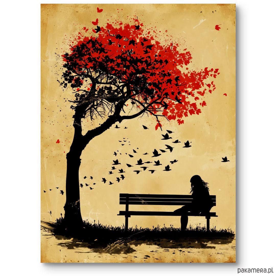 Plakat obrazuje samotną kobietę siedzącą na ławce pod drzewem, z którego opadają czerwone liście i wokół którego unoszą się czarne ptaki. To melancholijna scena pełna symboliki przemijania i samotności.