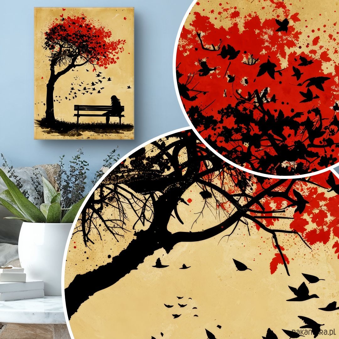 Plakat przyroda drzewo nostalgiczny do salonu czerwono-czarny