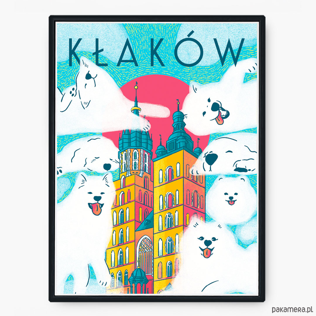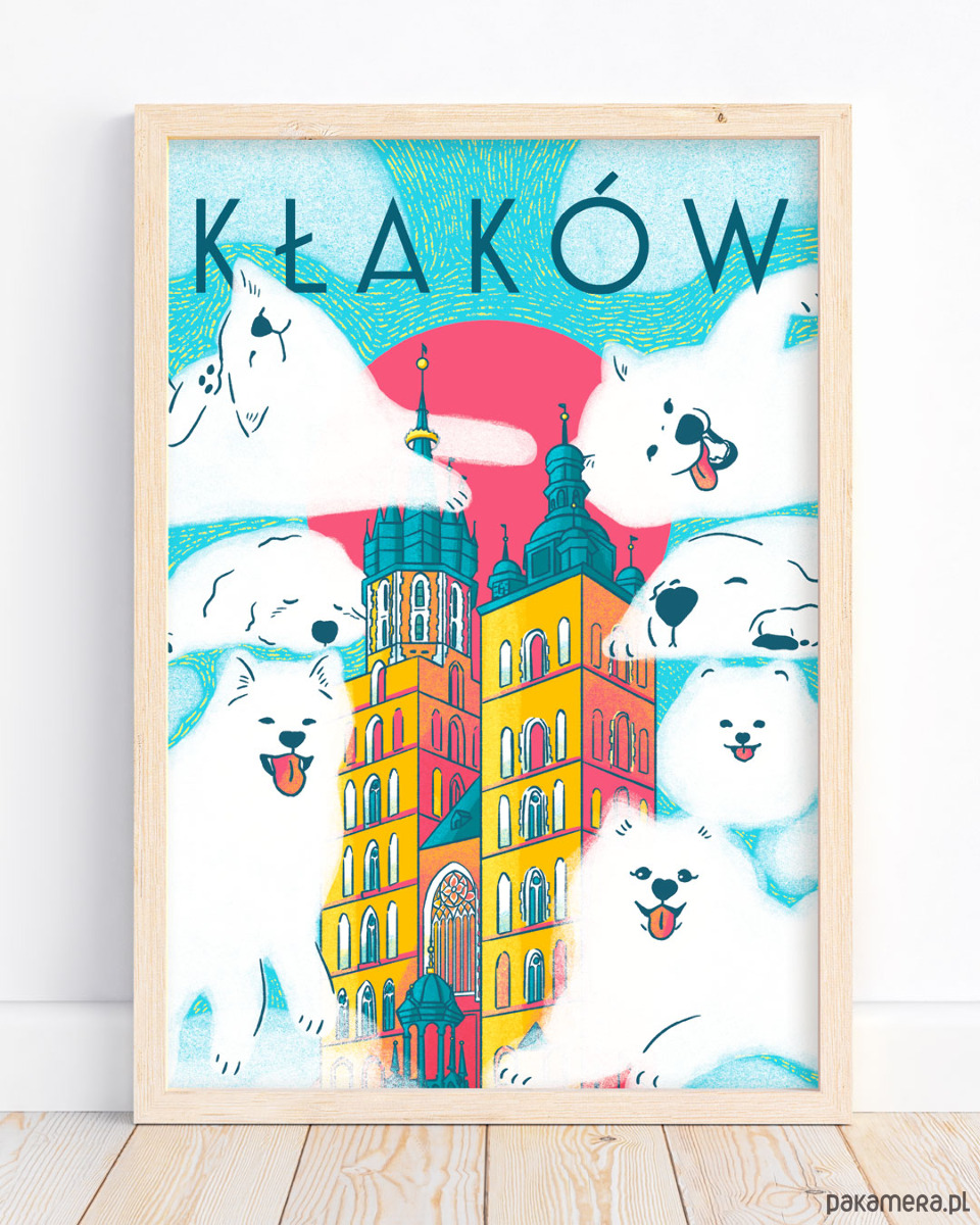 Humorystyczny plakat z psami, nawiązujący do Krakowa.