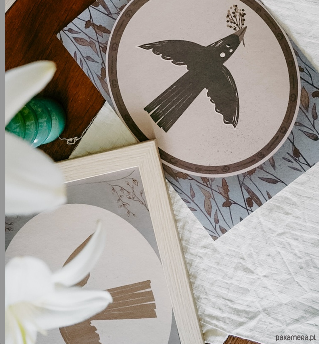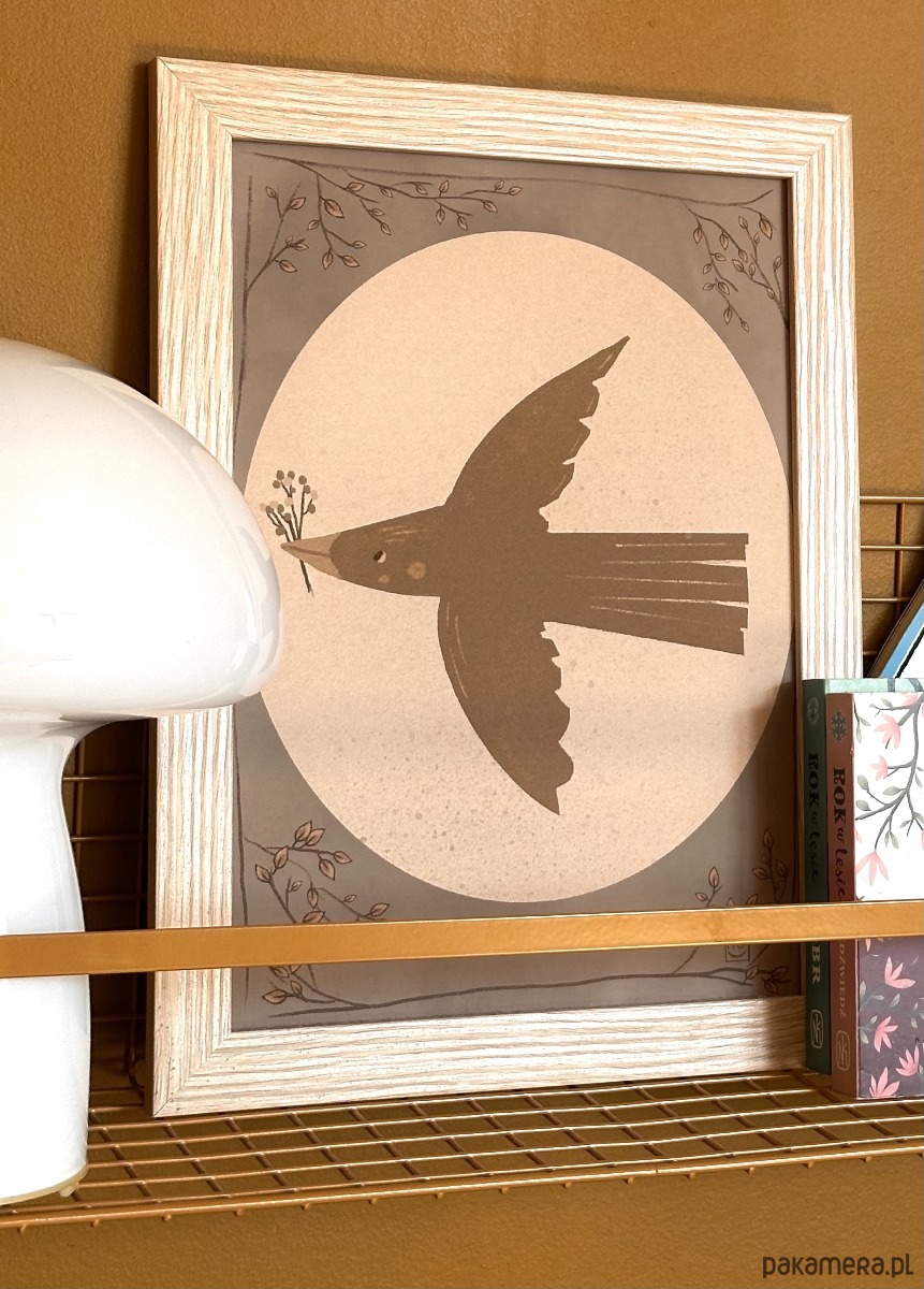 Plakat przedstawia subtelnego ptaszka, symbolizuje pokój i harmonię. Kompozycja jest utrzymana w łagodnych pastelowych odcieniach – miękkich beżach, pudrowych różach i stonowanych brązach, które tworzą harmonijną całość. Ptaszek ma delikatne piórka w jasnych, naturalnych barwach, a jego spojrzenie wyraża spokój i łagodność. Plakat ma uniwersalny charakter, idealny do wnętrz w stylu skandynawskim, boho czy nowoczesnym. To wyjątkowa dekoracja, która wprowadzi do każdego pomieszczenia odrobinę natury i subtelnej elegancji.