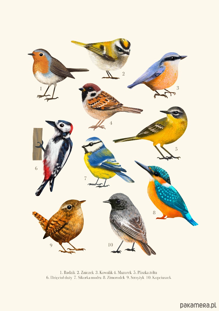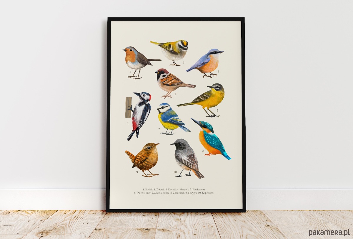 Autorski plakat przedstawiający wybrane gatunki ptaków Polski. Idealnie sprawdzi się w pokoju dziecięcym, gdzie będzie stanowił efektowną dekorację. Inspiracją do stworzenia plakatu były stare plansze szkolne i ilustracje w encyklopediach. Dzięki walorowi dydaktycznemu może być przyczynkiem do wspólnej nauki i zabawy. Każdy ptaszek jest opatrzony numerkiem, u dołu widać dokładne opisy, więc można bawić się z dzieckiem w odgadywanie nazw. Plakat jest wydrukowany na lekko fakturowanym papierze 200g. Plakat jest w rozmiarze 50x70cm.