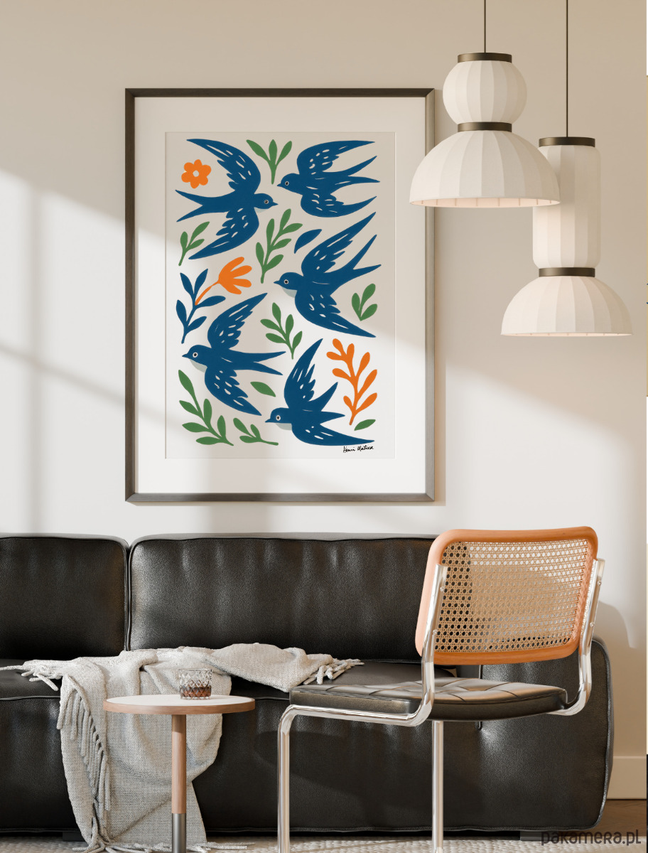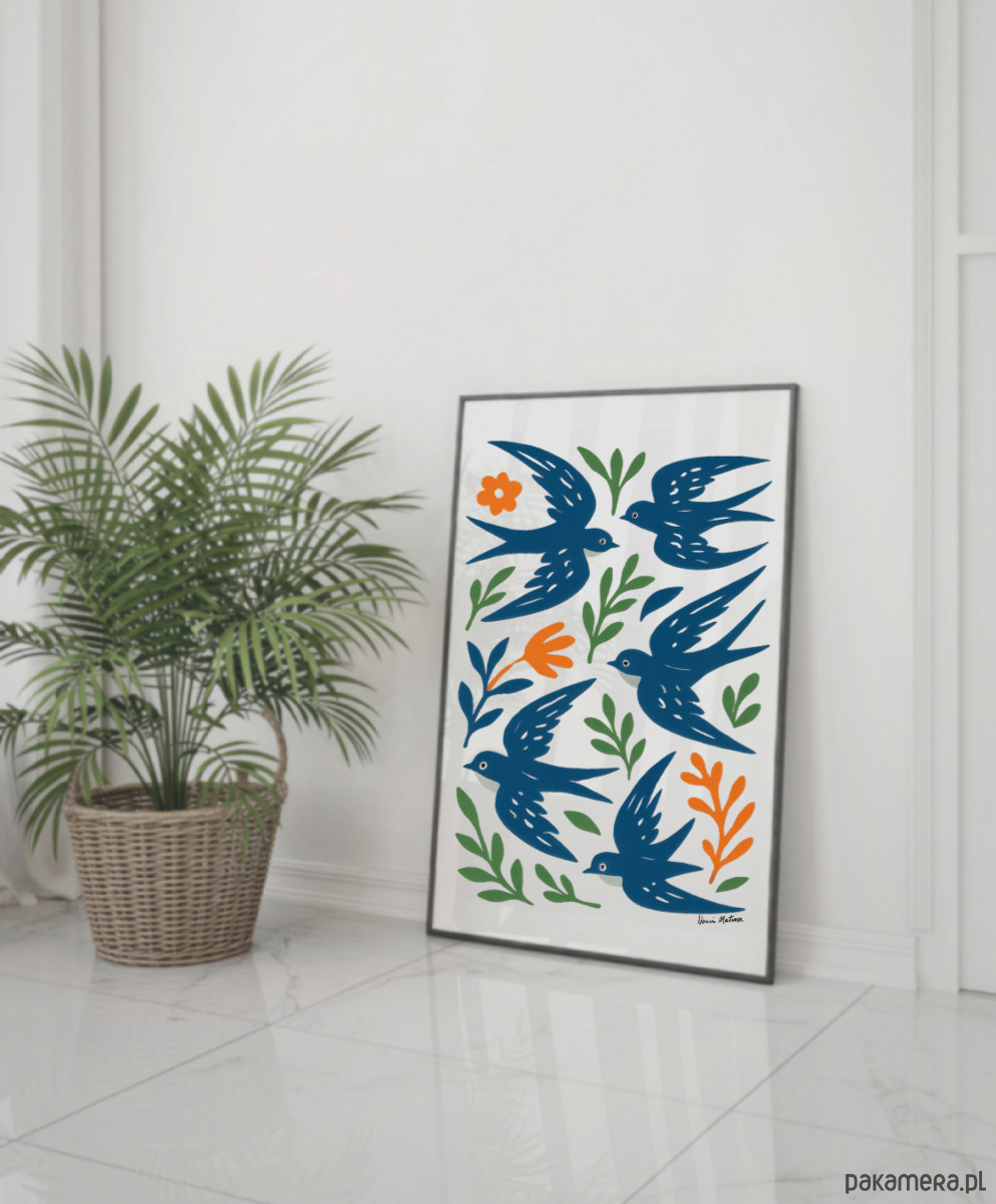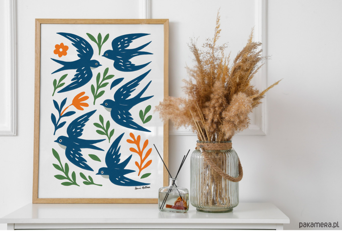 PLAKAT ptaki , jaskółki grafika, niebieska dekoracja ścienna, Matisse