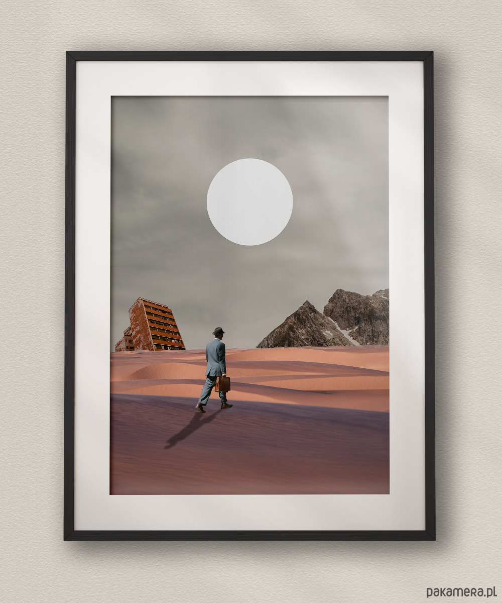 Surrealistyczny kolaż przedstawiający samotną postać mężczyzny w garniturze, kroczącego przez pustynię w stronę tajemniczego horyzontu. W tle widać monumentalne góry, opuszczony budynek oraz wielką białą kulę zawieszoną na niebie.