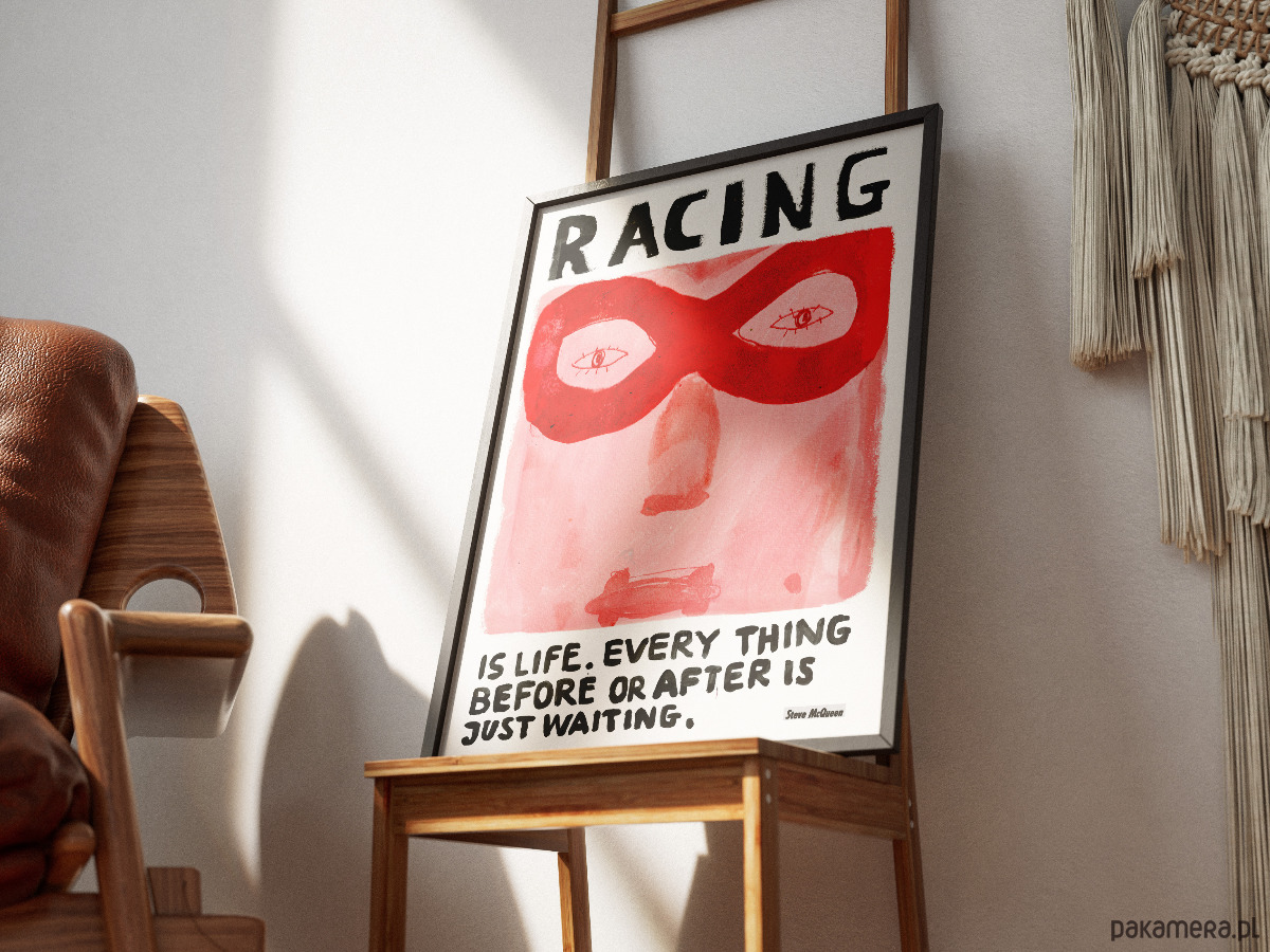 Plakat typograficzny RACING z cytatem dla fanów F1 motoryzacji.