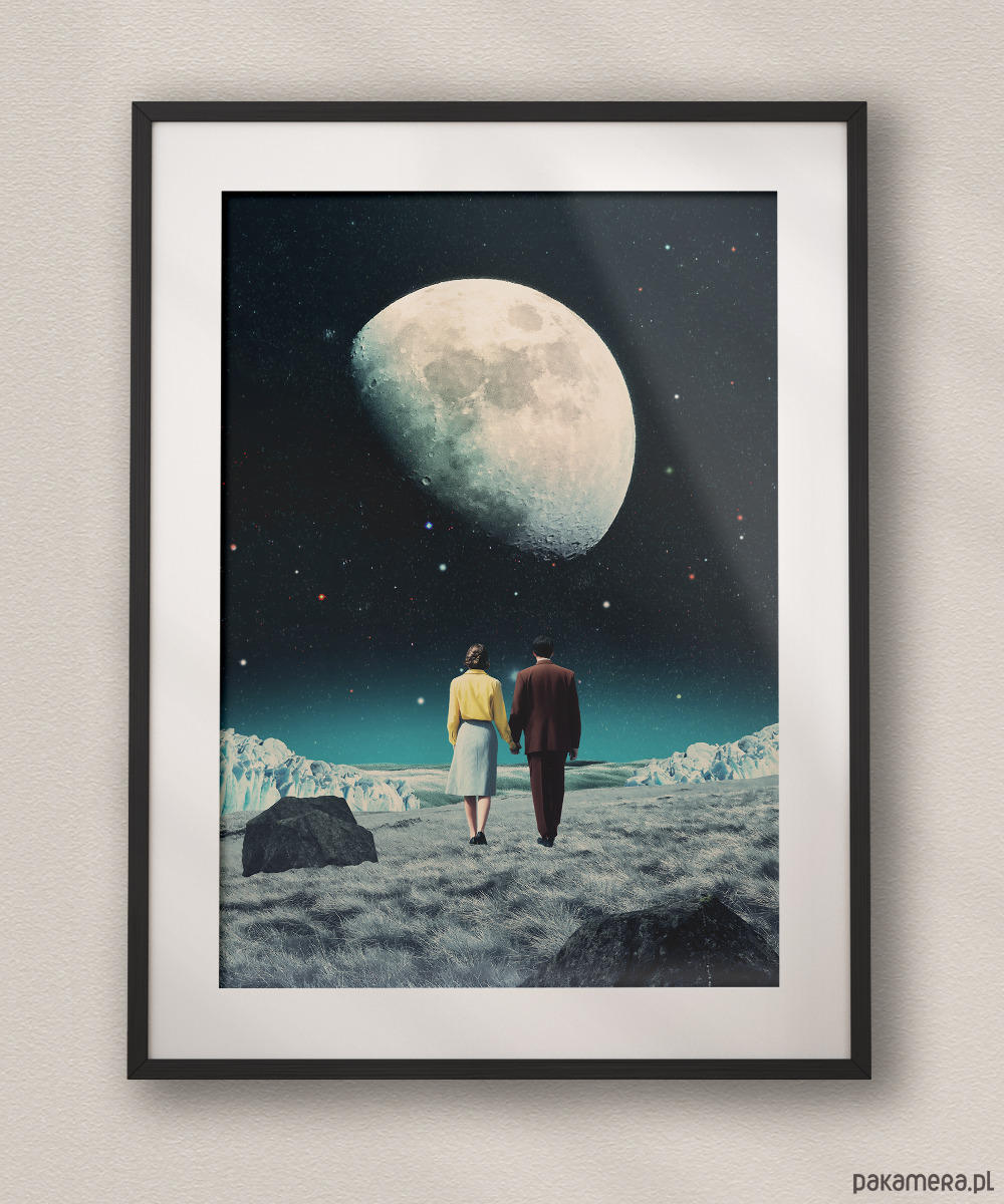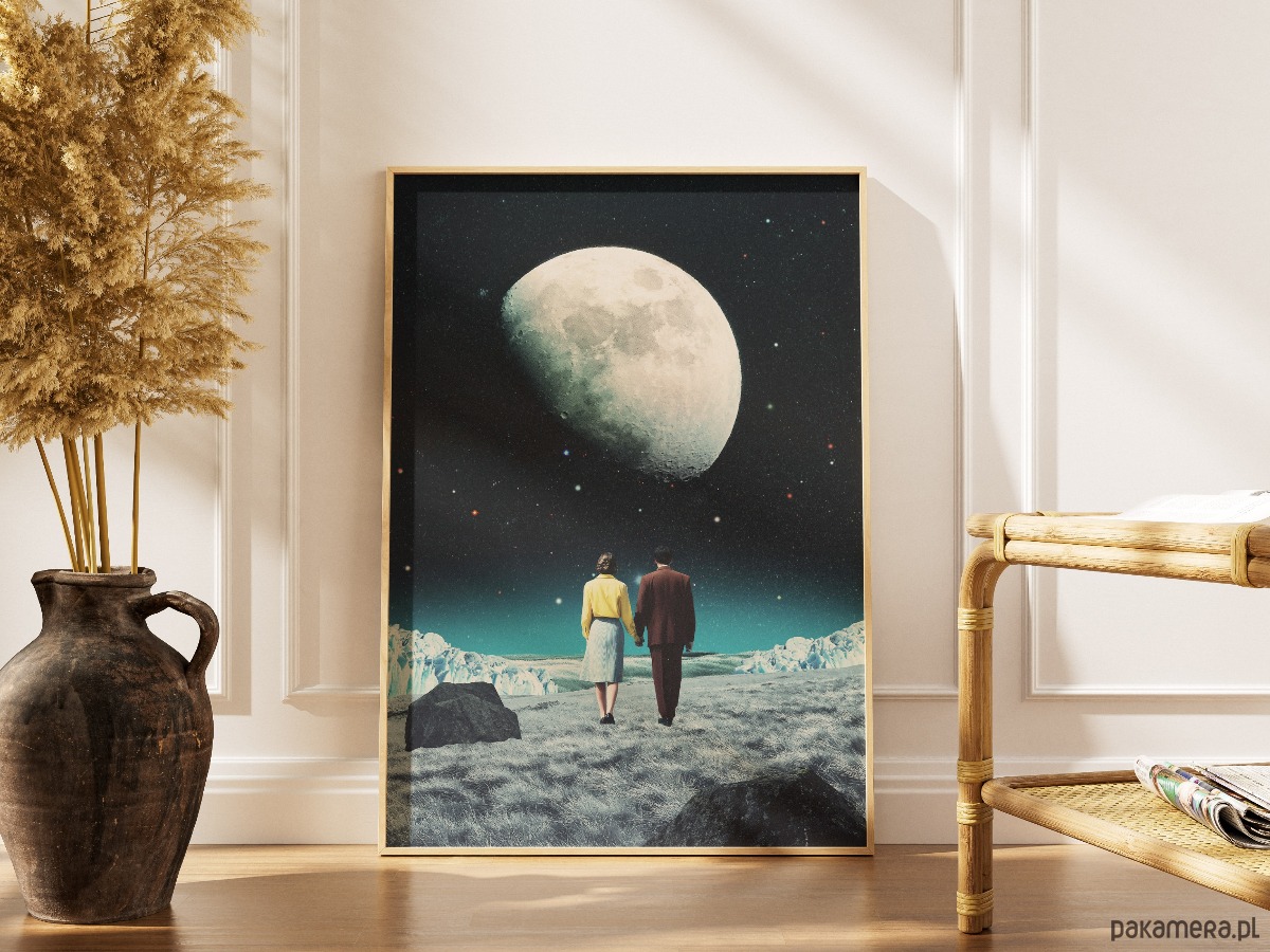 Plakat „Razem” – romantyczny kolaż artystyczny o miłości, bliskości i wspólnej drodze przez życie. Para stojąca na księżycowym krajobrazie spogląda w stronę wielkiego, rozświetlonego Księżyca. To metafora marzeń, które można osiągnąć tylko we dwoje – krok po kroku, ramię w ramię.