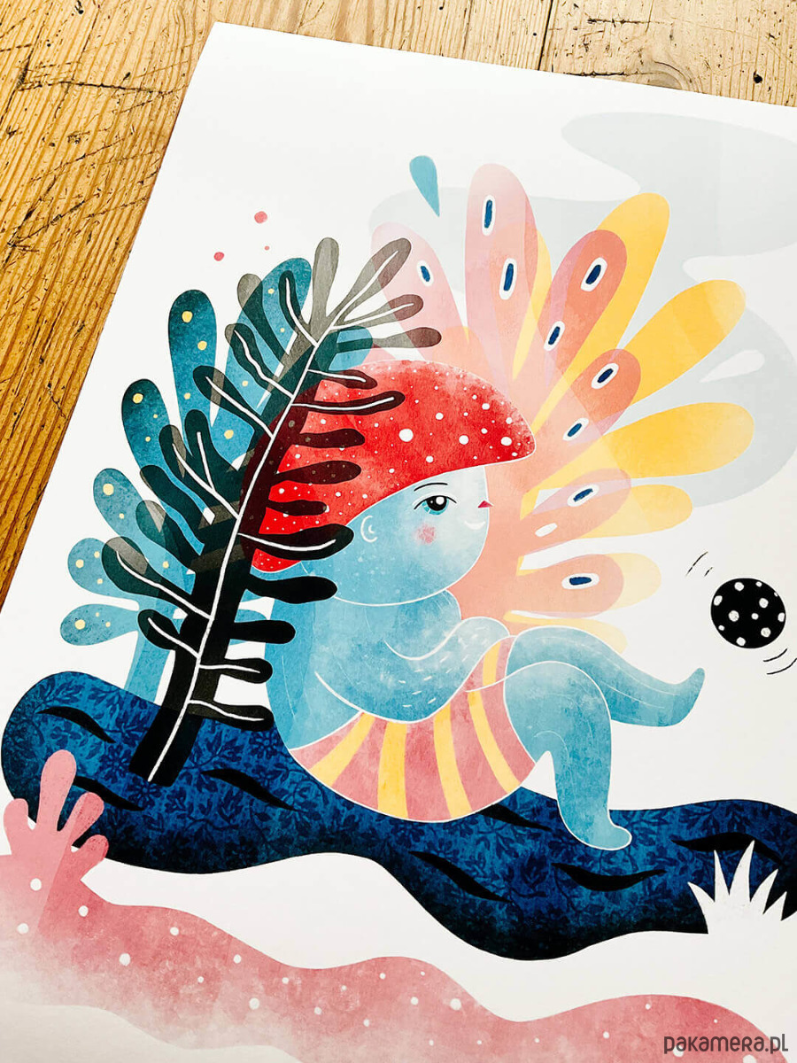 – plakat z autorską grafiką wykonaną w technice tradycyjnej (akwarela) i cyfrowej