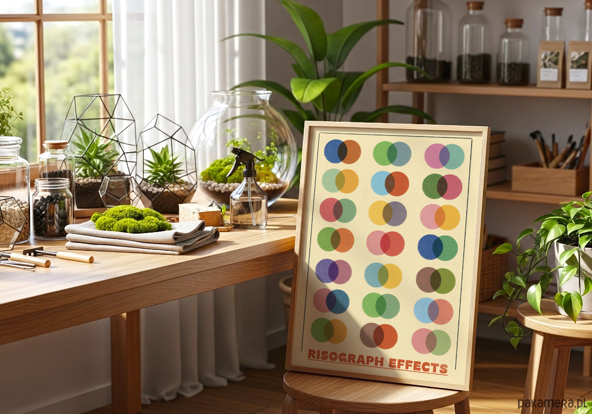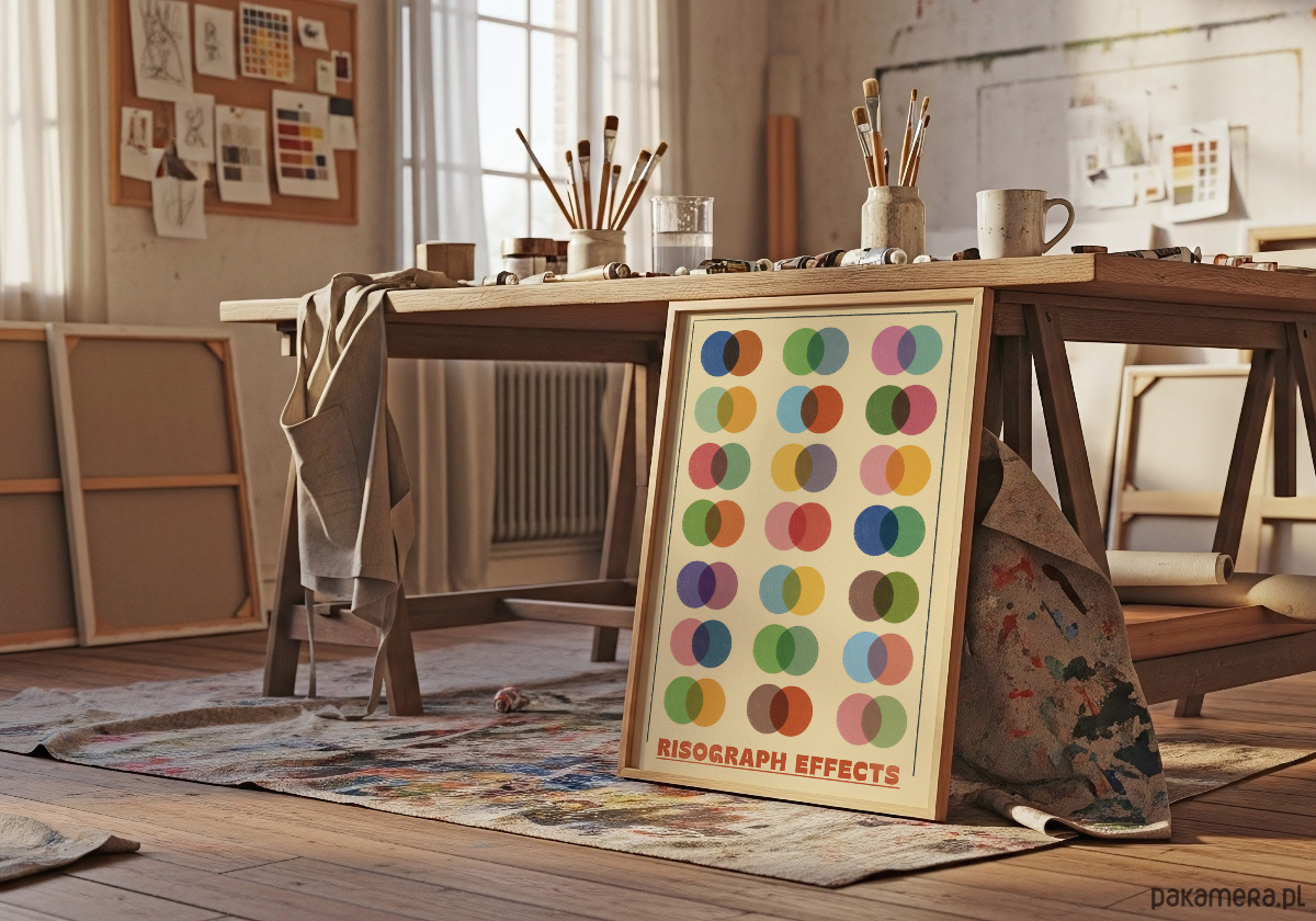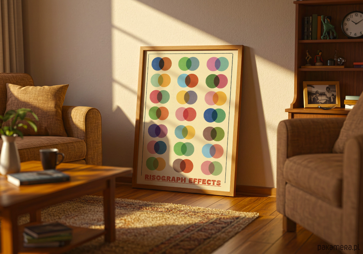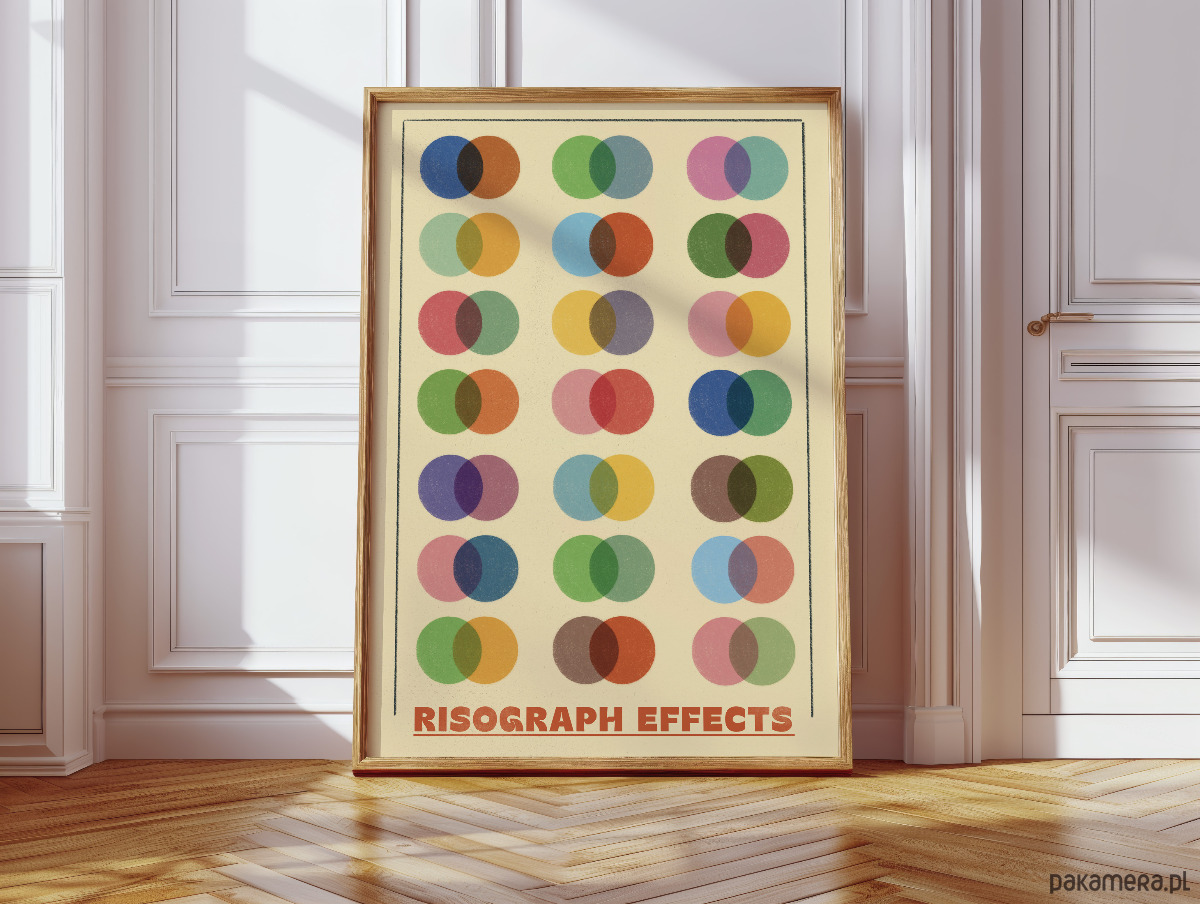 Ożyw swoją przestrzeń wyjątkowym plakatem prezentującym efekty druku risograficznego – techniki uwielbianej przez grafików i artystów na całym świecie. Ten estetyczny wydruk przedstawia siatkę nakładających się kolorowych kół, które tworzą nowe barwy w miejscach przecięcia, ukazując pełnię możliwości mieszania pigmentów w druku risograph. Plakat dodający do wnętrza retro charakter.