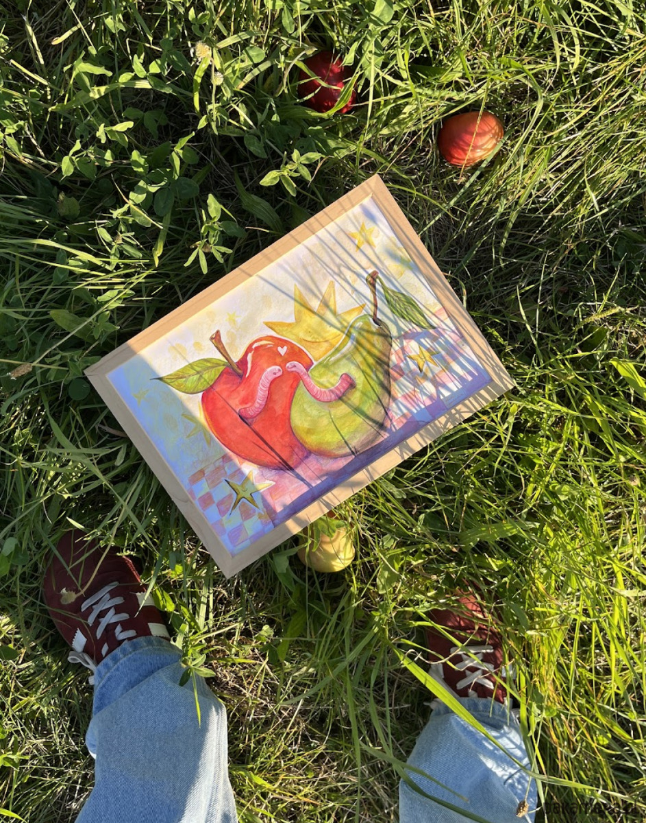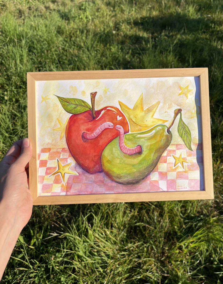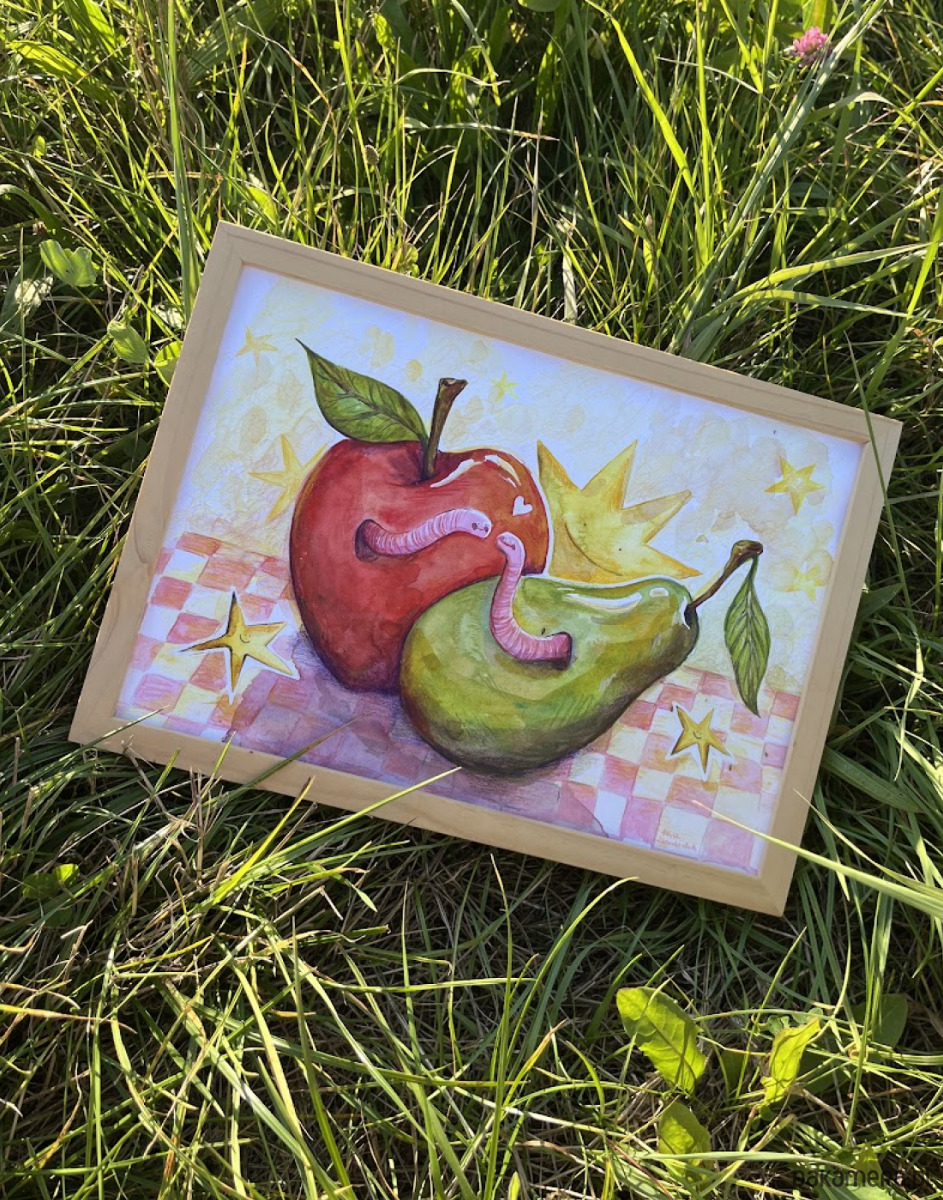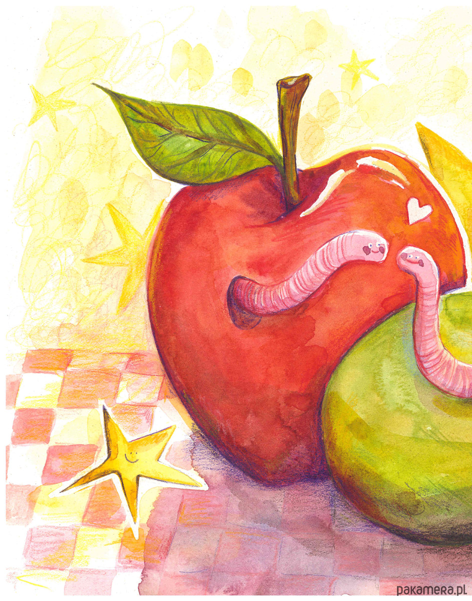Wesołe robaczki, które mieszkają w sąsiadujących owocach, to ilustracja, która budzi uśmiech i wspomnienia lata. Idealnie nadają się do pokoju dziecięcego czy biura.