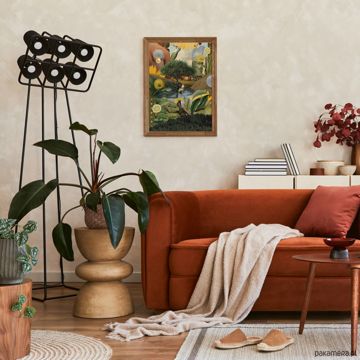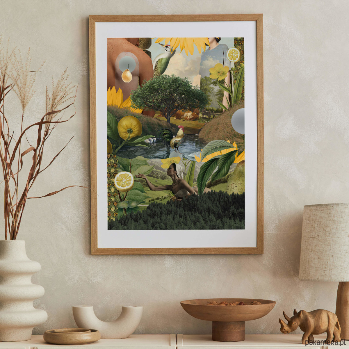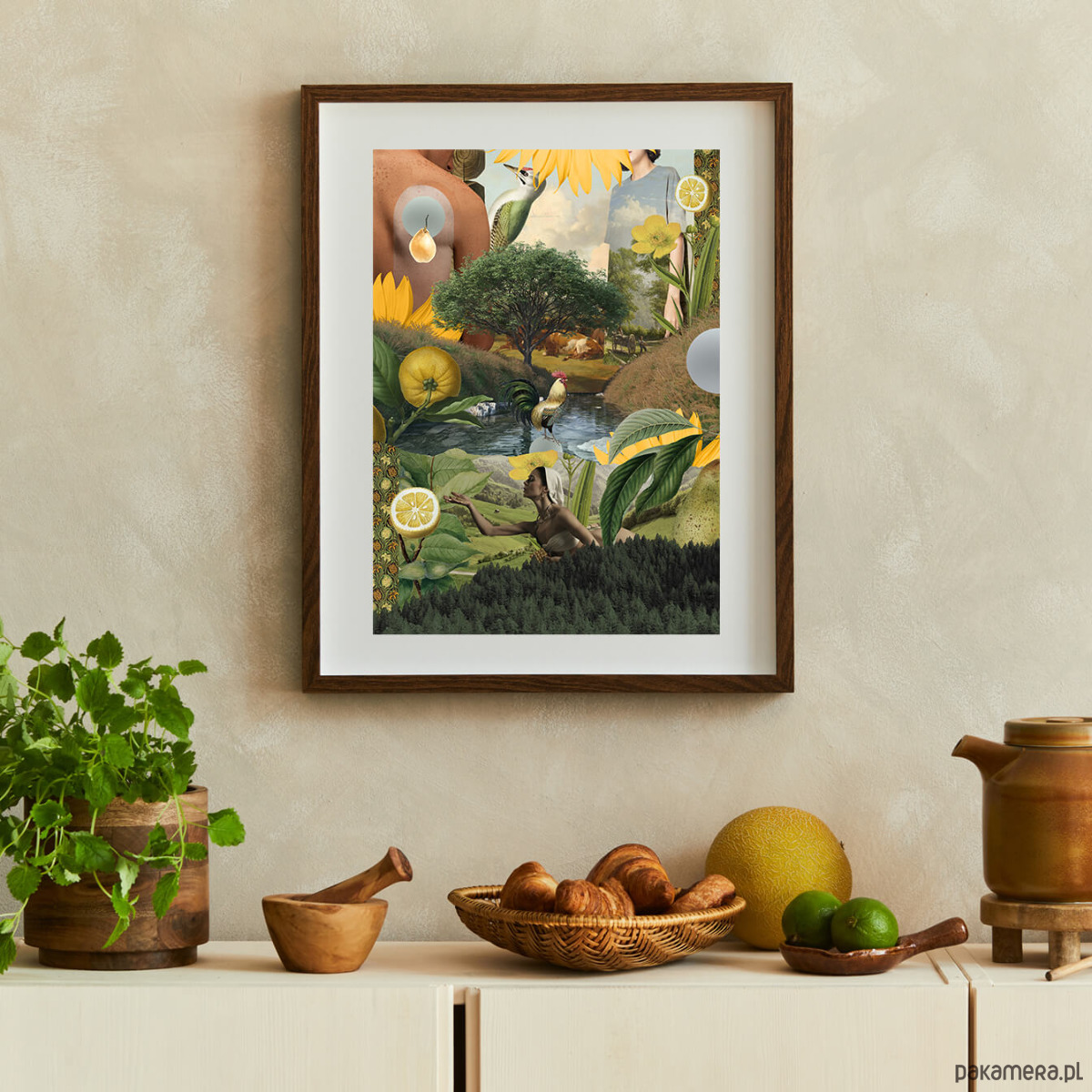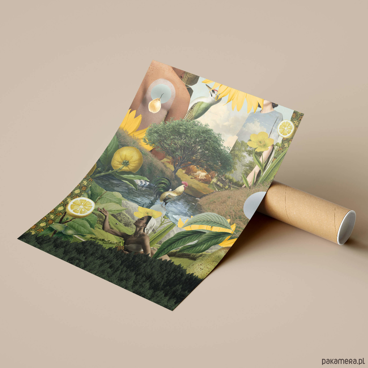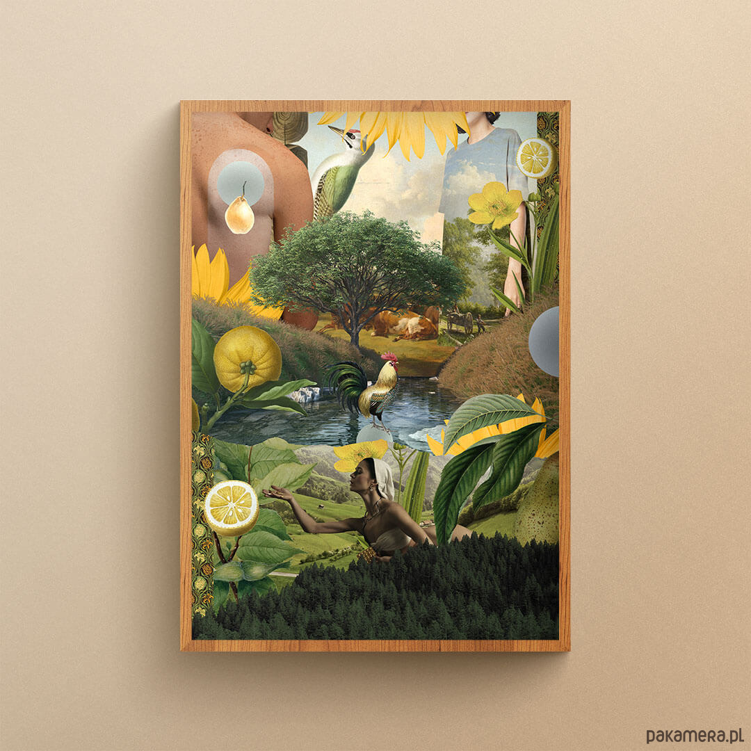 "Równowaga" to pełnowymiarowy kolaż bazujący na zielono - żółtej kolorystyce. Energiczny, świeży i soczysty kolaż przedstawia napawające optymizmem krajobrazy.