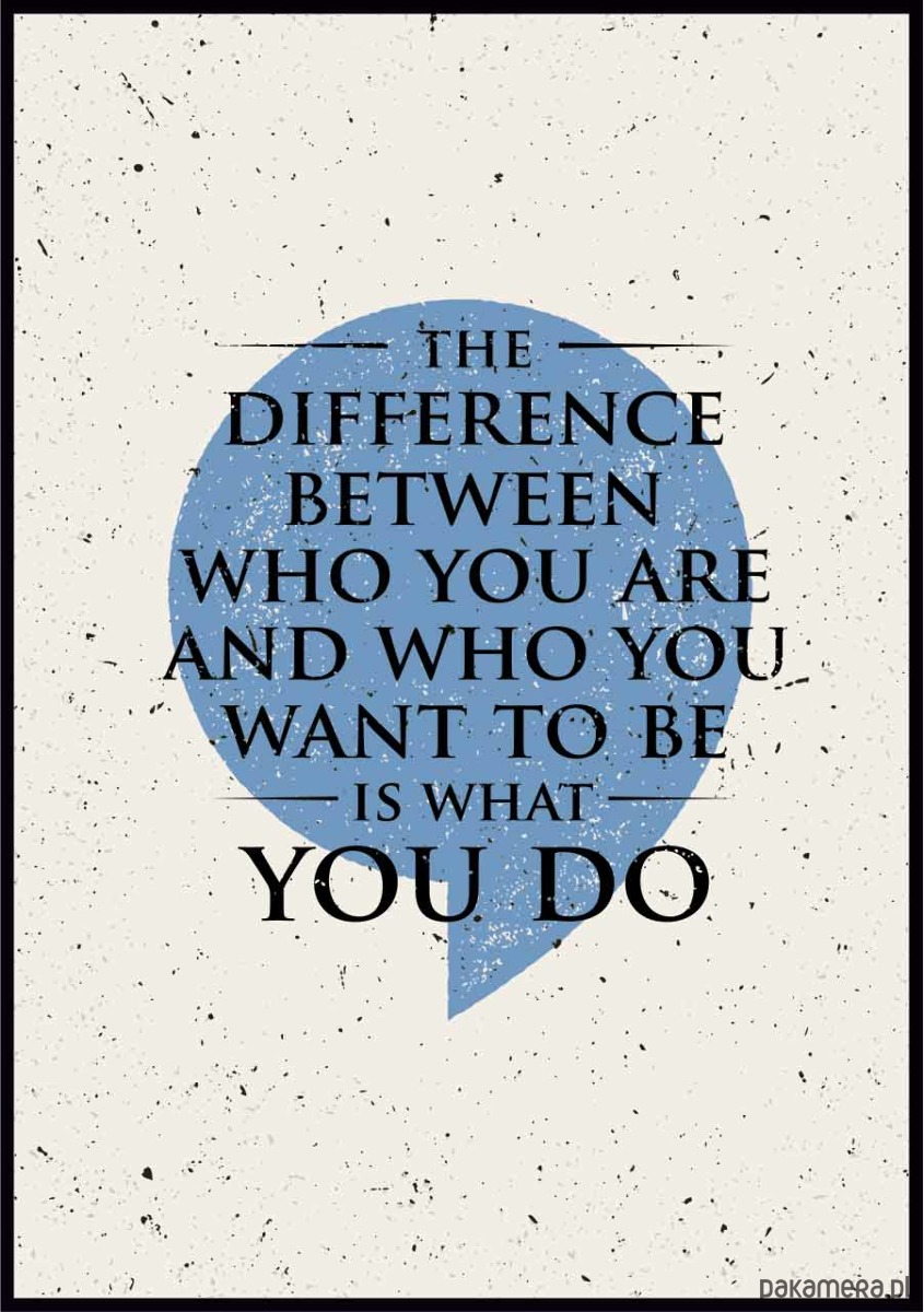 Motywacyjny plakat: "The difference between who you are and who you want to be is what you do". „Różnica między tym, kim jesteś, a tym, kim chcesz być, polega na tym, co robisz”.