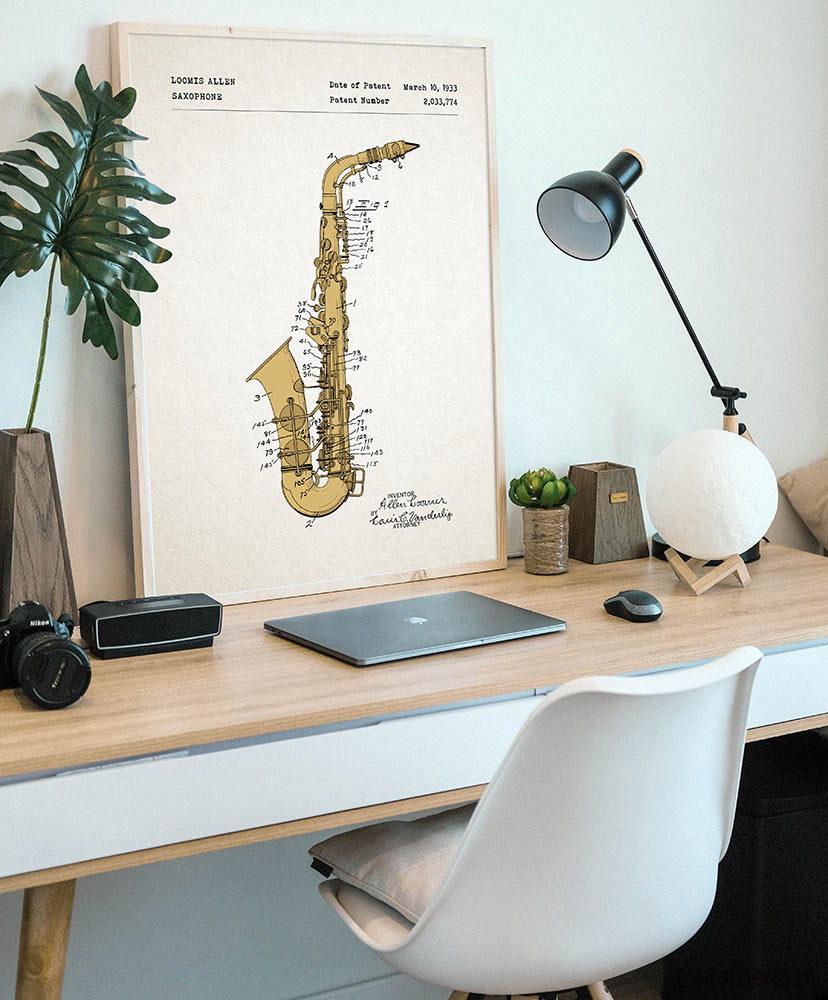 Plakat z reprodukcją patentu na konstrukcję saksofonu, autorstwa Loomisa Allena. Patent o numerze 2,033,774 został udzielony w 1933 roku przez Urząd Patentów i Znaków Towarowych Stanów Zjednoczonych.