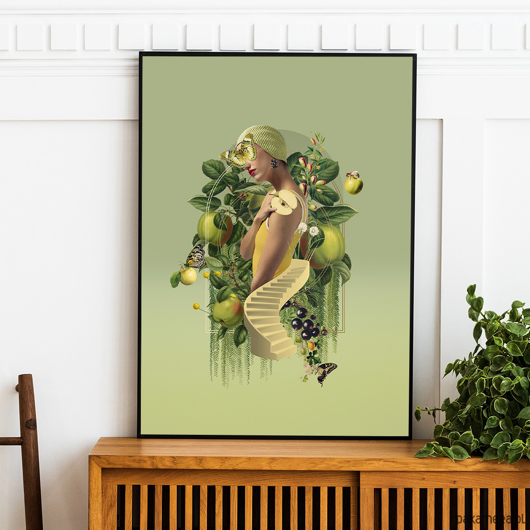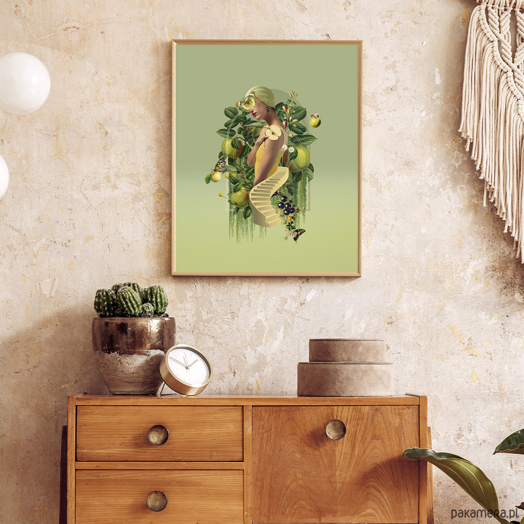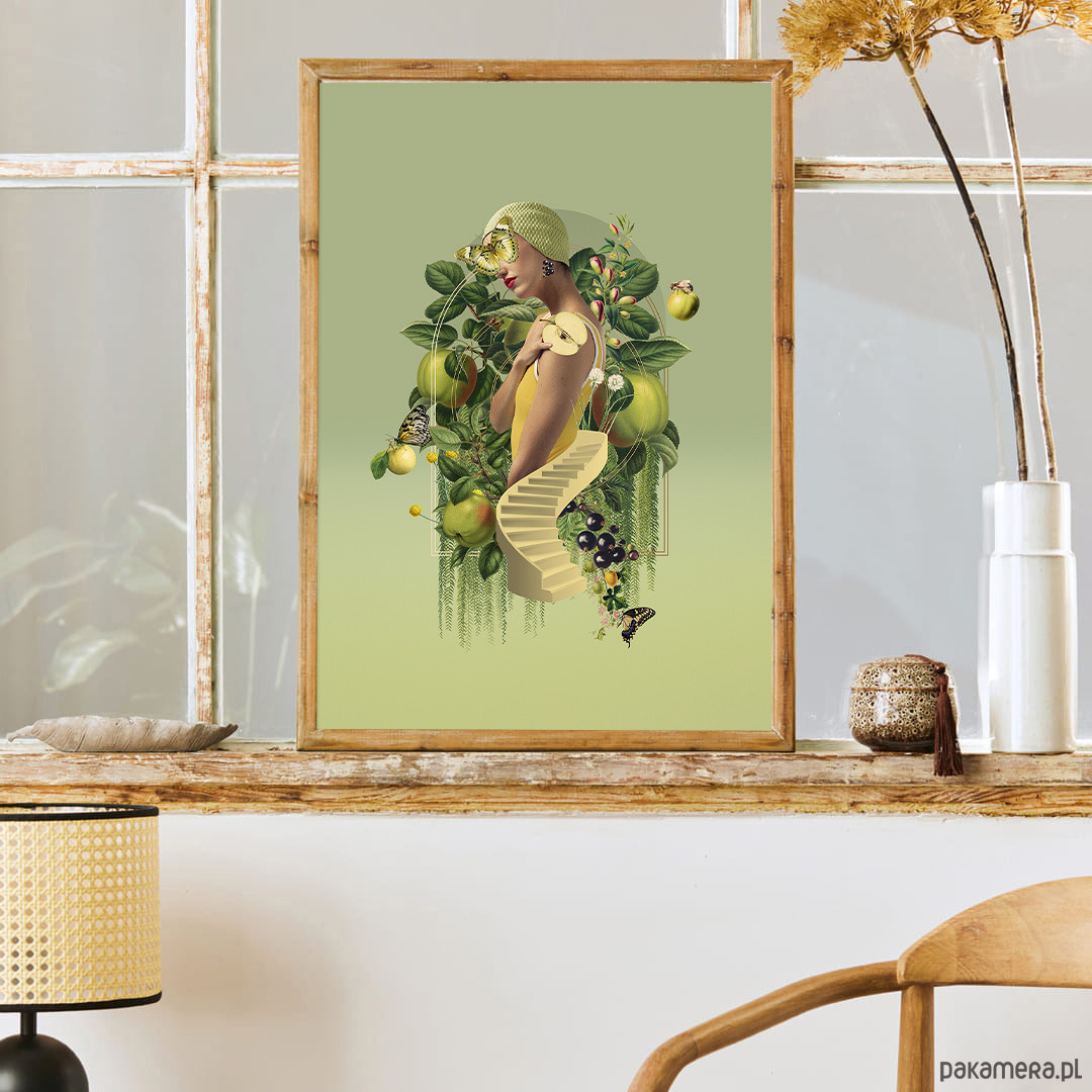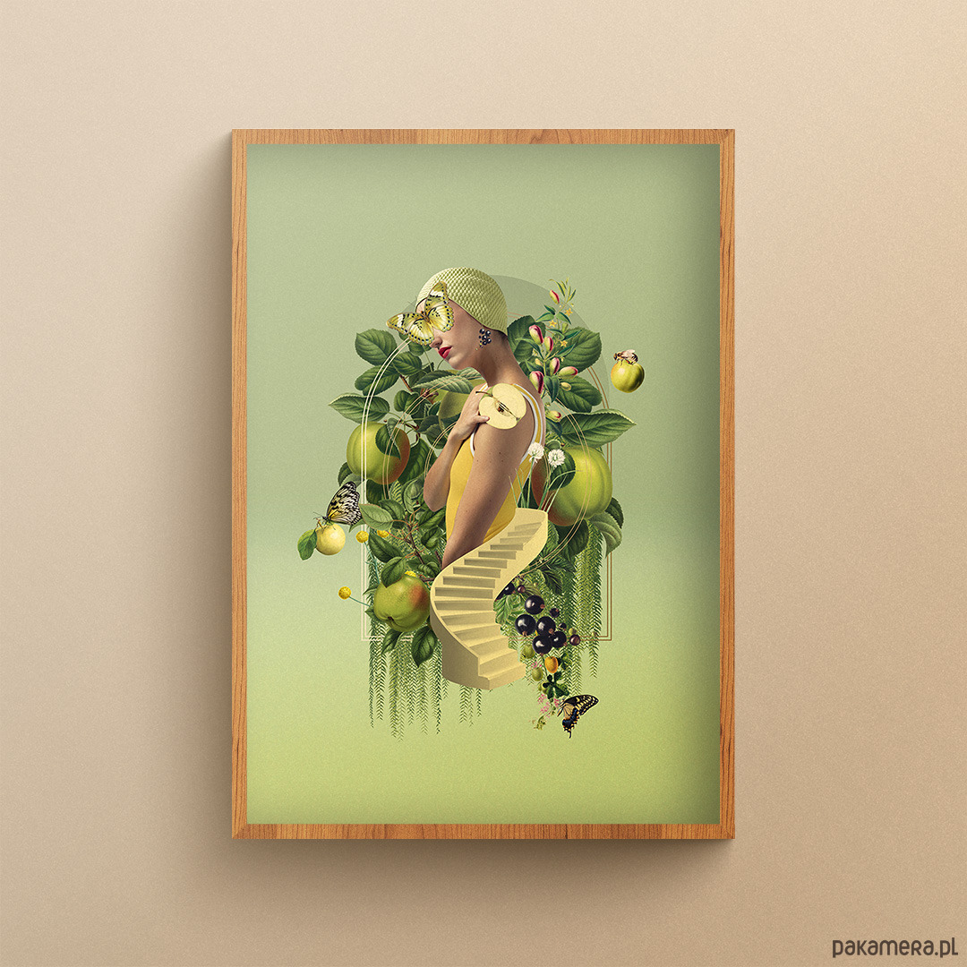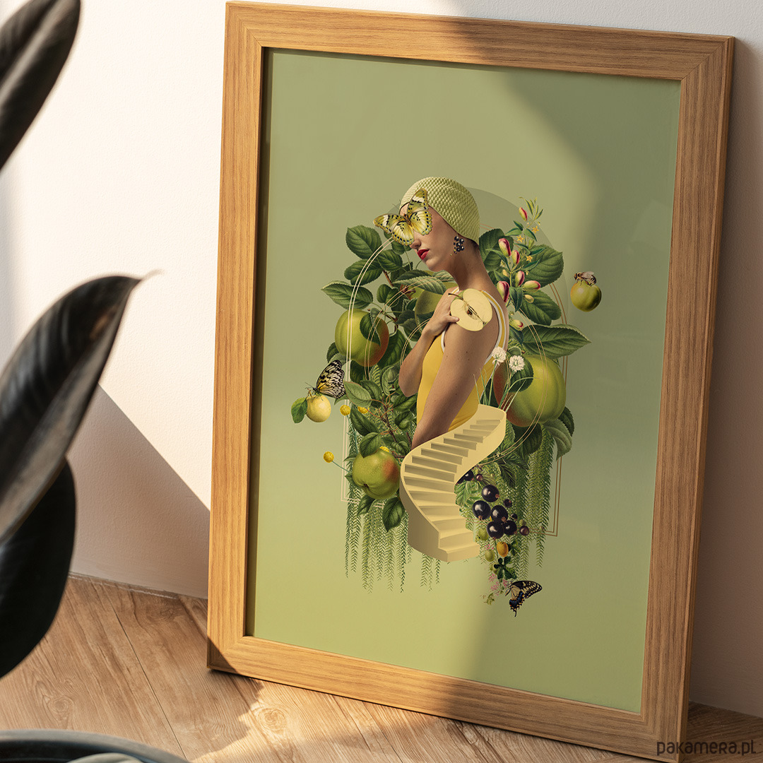 "Schody do natury". Artystyczny kolaż z wakacyjnej kolekcji to wyjątkowe połączenie natury, soczystych owoców i subtelnej elegancji. Delikatne motyle, spiralne schody i intensywna zieleń tworzą kompozycję pełną harmonii i świeżości. Idealny dla tych, którzy kochają nietuzinkowe dekoracje i chcą wprowadzić do wnętrza odrobinę magii i kolorowego lata!