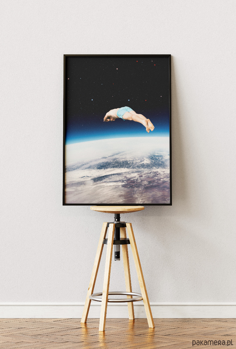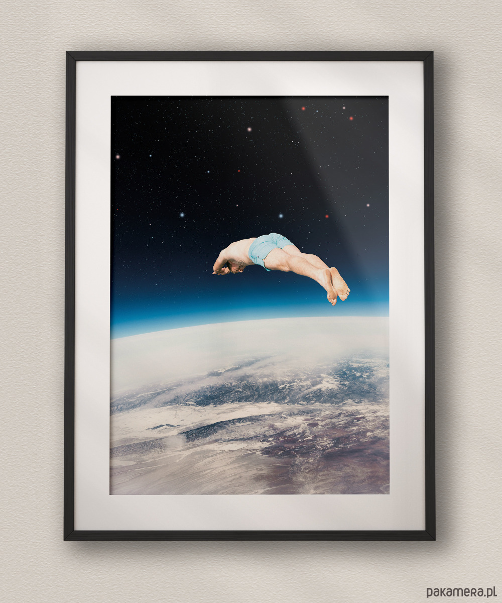 Minimalistyczny kolaż o surrealistycznym charakterze przedstawiający mężczyznę wykonującego skok wprost w bezkres kosmosu. Zestawienie sylwetki z monumentalnym widokiem Ziemi tworzy mocny kontrast między codziennością a nieskończonością, symbolizując odwagę, wolność i przekraczanie granic.